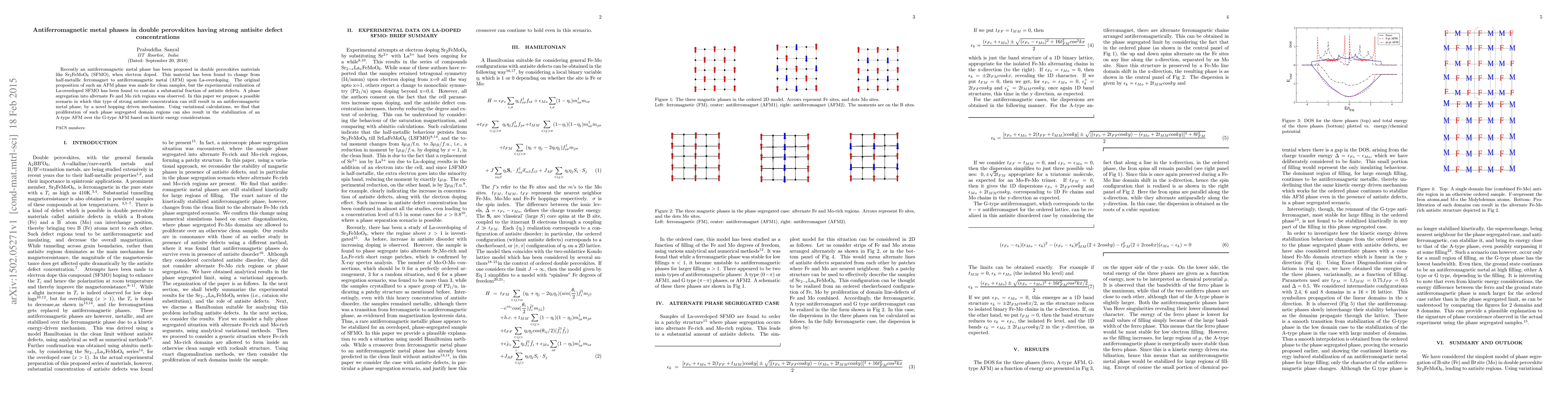 Recently an antiferromagnetic metal phase has been proposed in double perovskites materials like Sr$_{2}$FeMoO$_{6}$ (SFMO), when electron doped. This material has been found to change from half-metallic ferromagnet to antiferromagnetic metal (AFM) upon La-overdoping. The original proposition of such an AFM phase was made for clean samples, but the experimental realization of La-overdoped SFMO has been found to contain a substantial fraction of antisite defects. A phase segregation into alternate Fe and Mo rich regions was observed. In this paper we propose a possible scenario in which this type of strong antisite concentration can still result in an antiferromagnetic metal phase, by a novel hopping driven mechanism. Using variational calculations, we find that proliferation of such phase segregated domain regions can also result in the stabilization of an A-type AFM over the G-type AFM based on kinetic energy considerations.