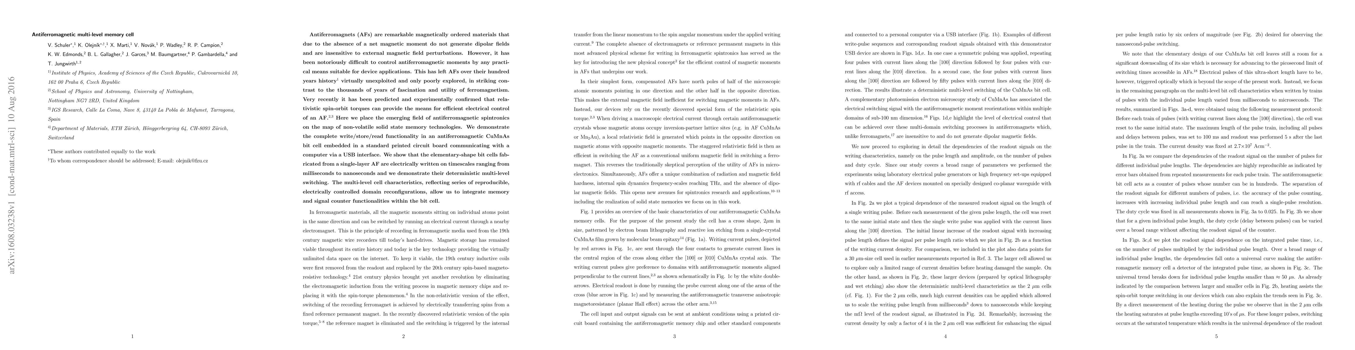 This paper explores the potential of antiferromagnetic materials for non-volatile memory applications, demonstrating the first electrically controlled, multi-level memory cell using CuMnAs. The study shows that antiferromagnetic bits can be written and read efficiently via spin-orbit torques, enabling fast, deterministic multi-level switching and integration of memory and signal counter functionalities.