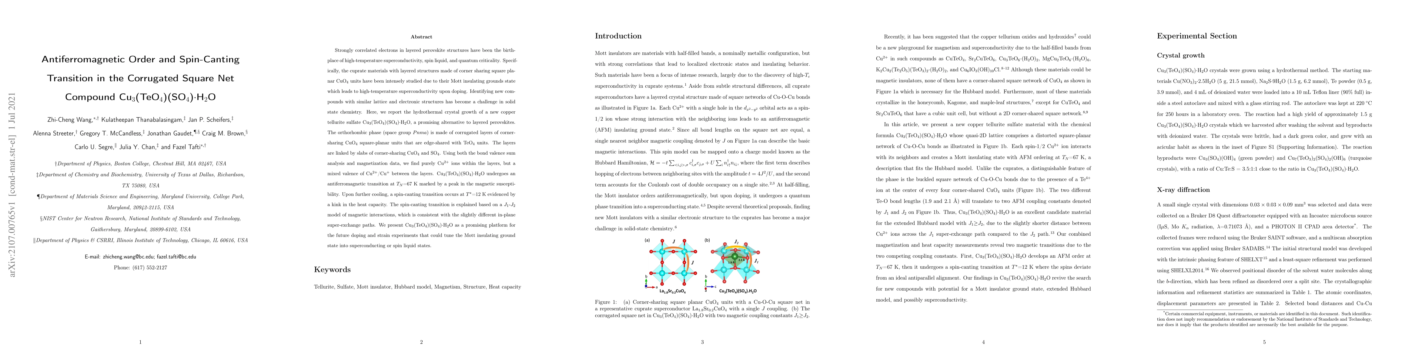 The paper reports the hydrothermal synthesis of Cu$_3$(TeO$_4$)(SO$_4$)$\cdot$H$_2$O, a layered compound with antiferromagnetic order transitioning to a spin-canting state at low temperatures, suggesting potential for tuning superconducting or spin liquid states.