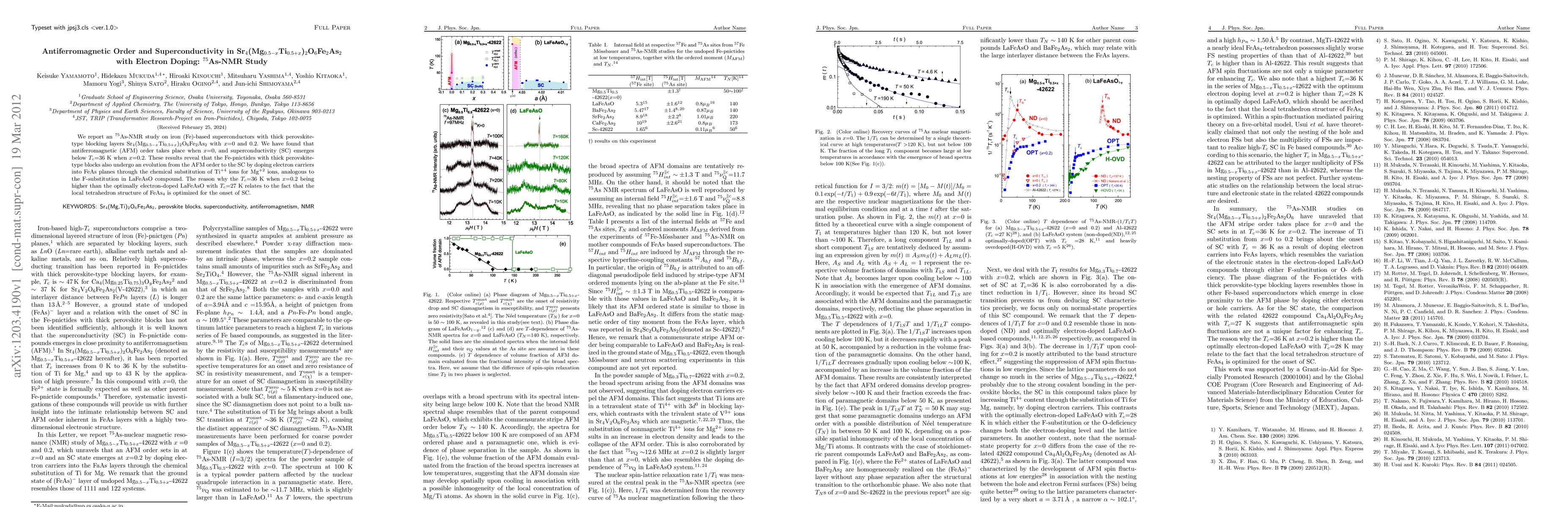 We report an 75As-NMR study on iron (Fe)-based superconductors with thick perovskitetype blocking layers Sr4(Mg0.5-xTi0.5+x)2O6Fe2As2 with x=0 and 0.2. We have found that antiferromagnetic (AFM) order takes place when x=0, and superconductivity (SC) emerges below Tc=36 K when x=0.2. These results reveal that the Fe-pnictides with thick perovskitetype blocks also undergo an evolution from the AFM order to the SC by doping electron carriers into FeAs planes through the chemical substitution of Ti+4 ions for Mg+2 ions, analogous to the F-substitution in LaFeAsO compound. The reason why the Tc=36 K when x=0.2 being higher than the optimally electron-doped LaFeAsO with Tc=27 K relates to the fact that the local tetrahedron structure of FeAs4 is optimized for the onset of SC.