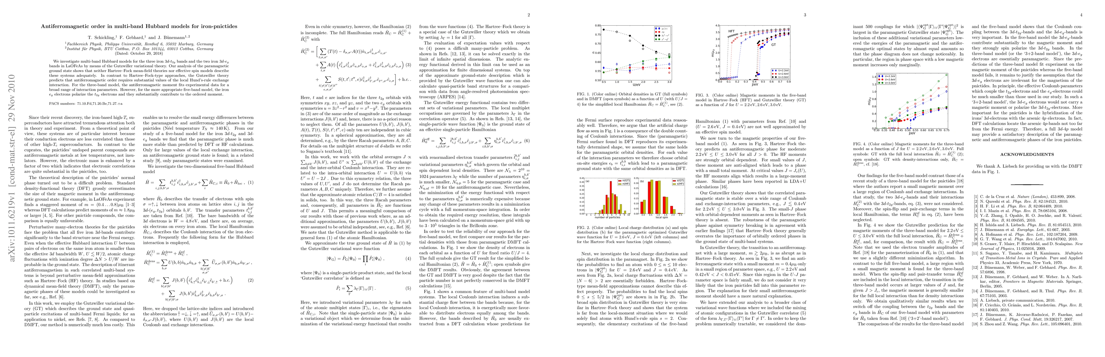 This paper explores multi-band Hubbard models for iron-pnictides using Gutzwiller variational theory, finding that antiferromagnetic order necessitates significant Hund's-rule exchange interactions. The five-band model reveals that $e_g$ electrons significantly contribute to the antiferromagnetic moment, differing from Hartree-Fock approaches.