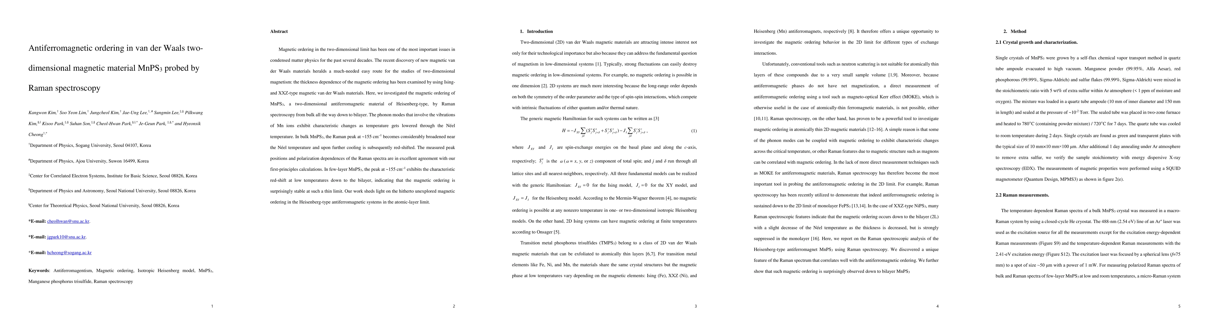 This study investigates the antiferromagnetic ordering in the two-dimensional van der Waals material MnPS3 using Raman spectroscopy, revealing significant changes in phonon modes associated with Mn ions as temperature drops through the Néel temperature. The magnetic ordering remains stable even in bilayer form, indicating robustness in the Heisenberg-type antiferromagnetic systems at the atomic layer limit.