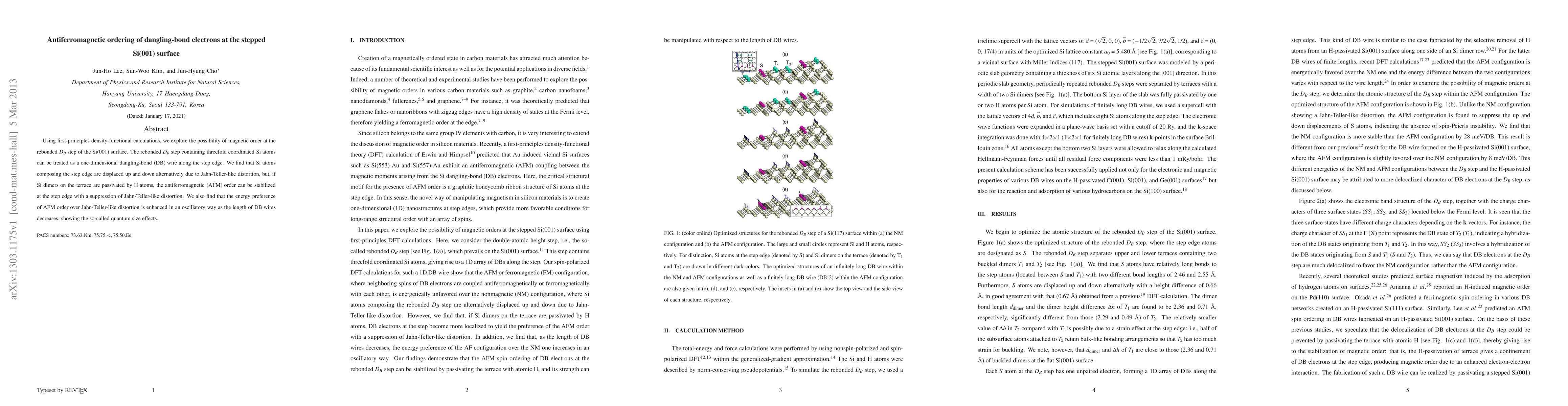Using first-principles density-functional calculations, we explore the possibility of magnetic order at the rebonded $D_B$ step of the Si(001) surface. The rebonded $D_B$ step containing threefold coordinated Si atoms can be treated as a one-dimensional dangling-bond (DB) wire along the step edge. We find that Si atoms composing the step edge are displaced up and down alternatively due to Jahn-Teller-like distortion, but, if Si dimers on the terrace are passivated by H atoms, the antiferromagnetic (AFM) order can be stabilized at the step edge with a suppression of Jahn-Teller-like distortion. We also find that the energy preference of AFM order over Jahn-Teller-like distortion is enhanced in an oscillatory way as the length of DB wires decreases, showing the so-called quantum size effects.