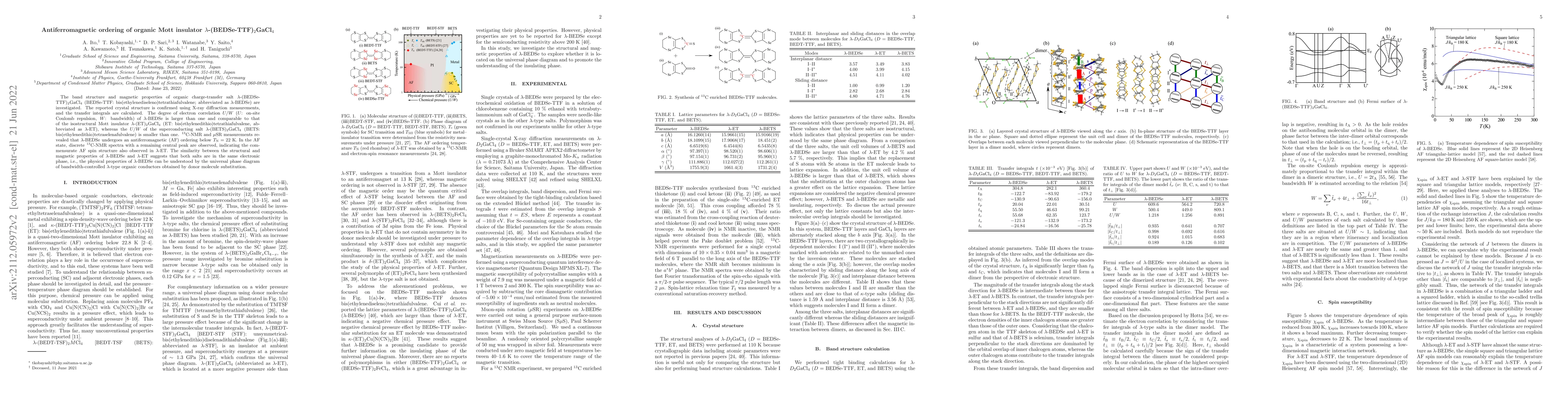 This paper investigates the magnetic properties of the organic charge-transfer salt $\lambda$-(BEDSe-TTF)$_2$GaCl$_4$, revealing antiferromagnetic ordering below $T_{\rm N} = 22$~K. The study confirms the crystal structure and finds that $\lambda$-BEDSe exhibits strong electron correlation, similar to the Mott insulator $\lambda$-(ET)$_2$GaCl$_4$.