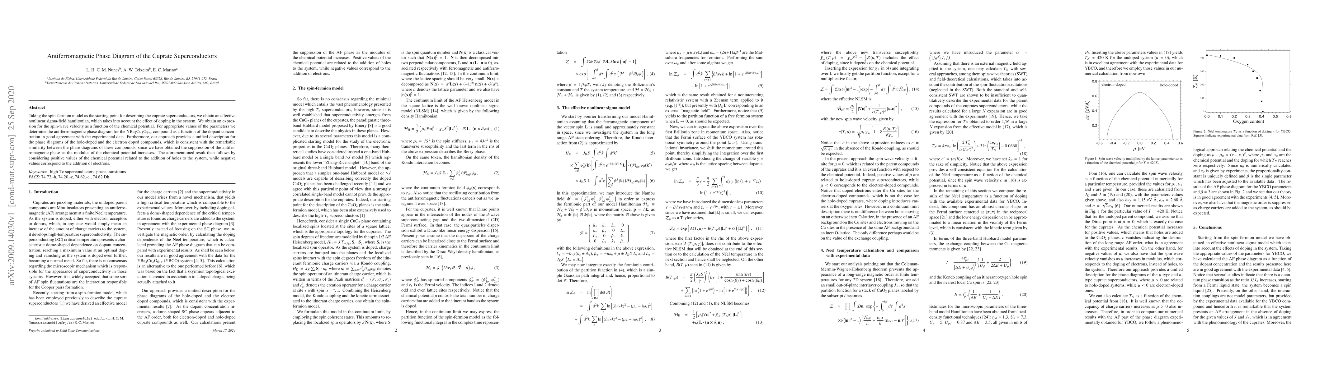 Taking the spin-fermion model as the starting point for describing the cuprate superconductors, we obtain an effective nonlinear sigma-field hamiltonian, which takes into account the effect of doping in the system. We obtain an expression for the spin-wave velocity as a function of the chemical potential. For appropriate values of the parameters we determine the antiferromagnetic phase diagram for the YBa$_2$Cu$_3$O$_{6+x}$ compound as a function of the dopant concentration in good agreement with the experimental data. Furthermore, our approach provides a unified description for the phase diagrams of the hole-doped and the electron doped compounds, which is consistent with the remarkable similarity between the phase diagrams of these compounds, since we have obtained the suppression of the antiferromagnetic phase as the modulus of the chemical potential increases. The aforementioned result then follows by considering positive values of the chemical potential related to the addition of holes to the system, while negative values correspond to the addition of electrons.