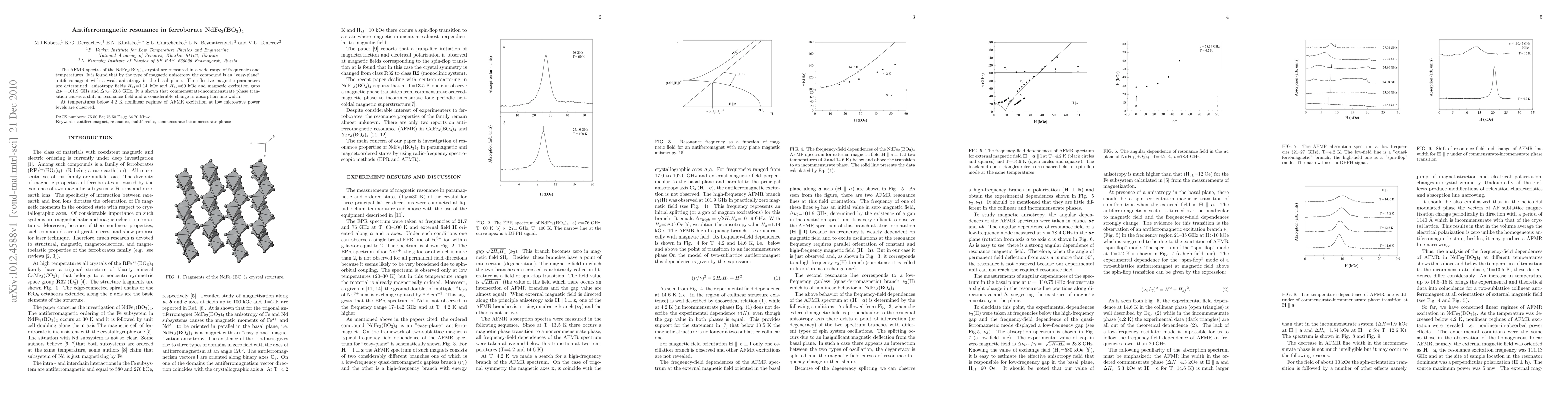 The research investigates the antiferromagnetic resonance (AFMR) in NdFe$_3$(BO$_3$)$_4$, identifying it as an "easy-plane" antiferromagnet with weak anisotropy. Key magnetic parameters and a phase transition-induced shift in resonance field are determined.
