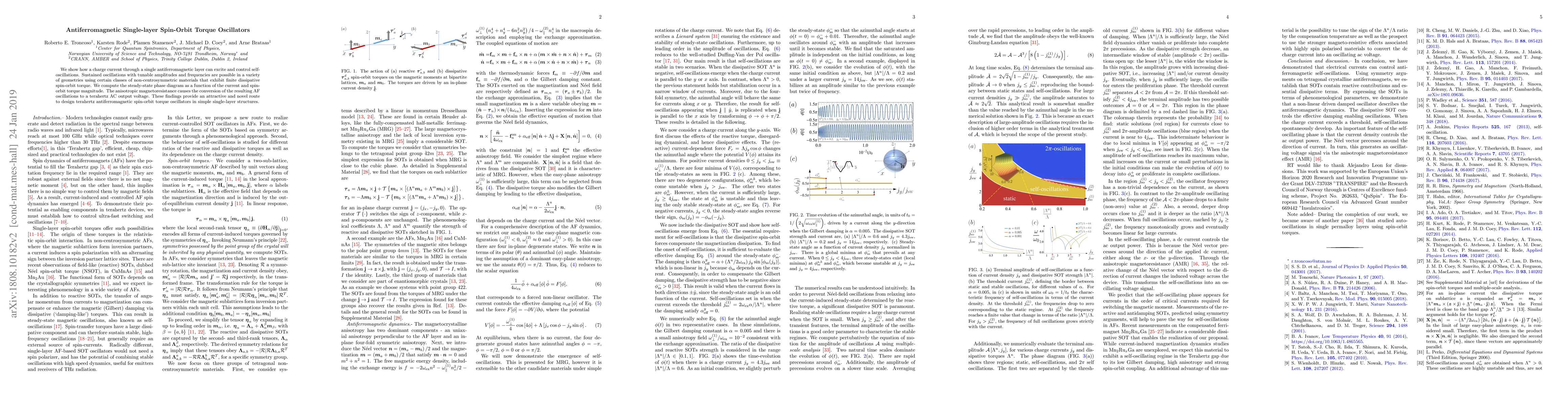 This paper demonstrates that a charge current can excite and control self-oscillations in single-layer antiferromagnetic materials, enabling tunable terahertz frequency outputs through spin-orbit torque effects and anisotropic magnetoresistance. The study presents a phase diagram for sustained oscillations under varying current and spin-orbit torque.