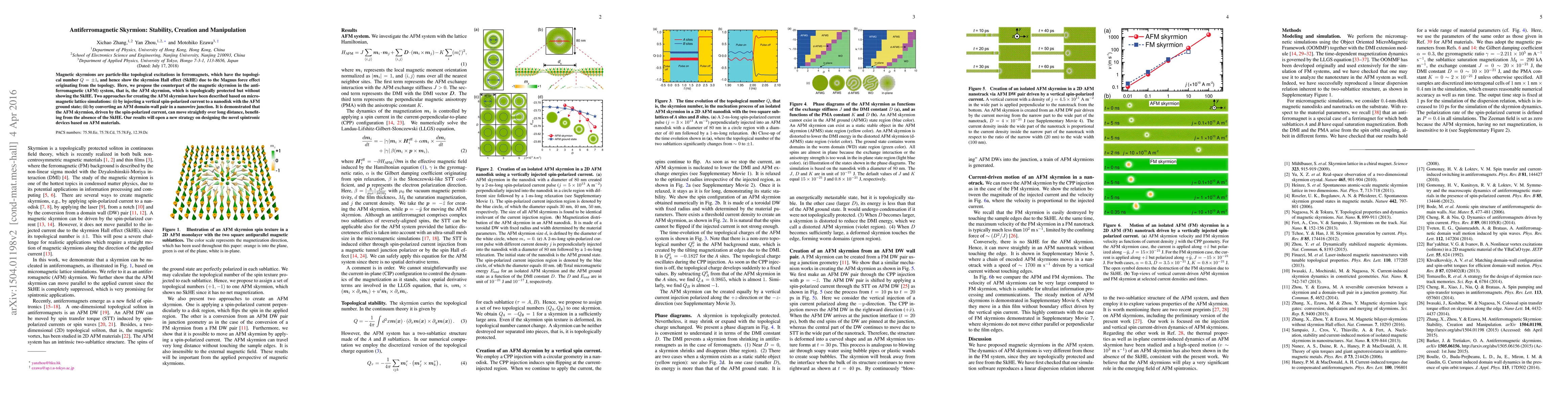 Magnetic skyrmions are particle-like topological excitations in ferromagnets, which have the topological number $Q=\pm 1$, and hence show the skyrmion Hall effect (SkHE) due to the Magnus force effect originating from the topology. Here, we propose the counterpart of the magnetic skyrmion in the antiferromagnetic (AFM) system, that is, the AFM skyrmion, which is topologically protected but without showing the SkHE. Two approaches for creating the AFM skyrmion have been described based on micromagnetic lattice simulations: (i) by injecting a vertical spin-polarized current to a nanodisk with the AFM ground state; (ii) by converting an AFM domain-wall pair in a nanowire junction. It is demonstrated that the AFM skyrmion, driven by the spin-polarized current, can move straightly over long distance, benefiting from the absence of the SkHE. Our results will open a new strategy on designing the novel spintronic devices based on AFM materials.