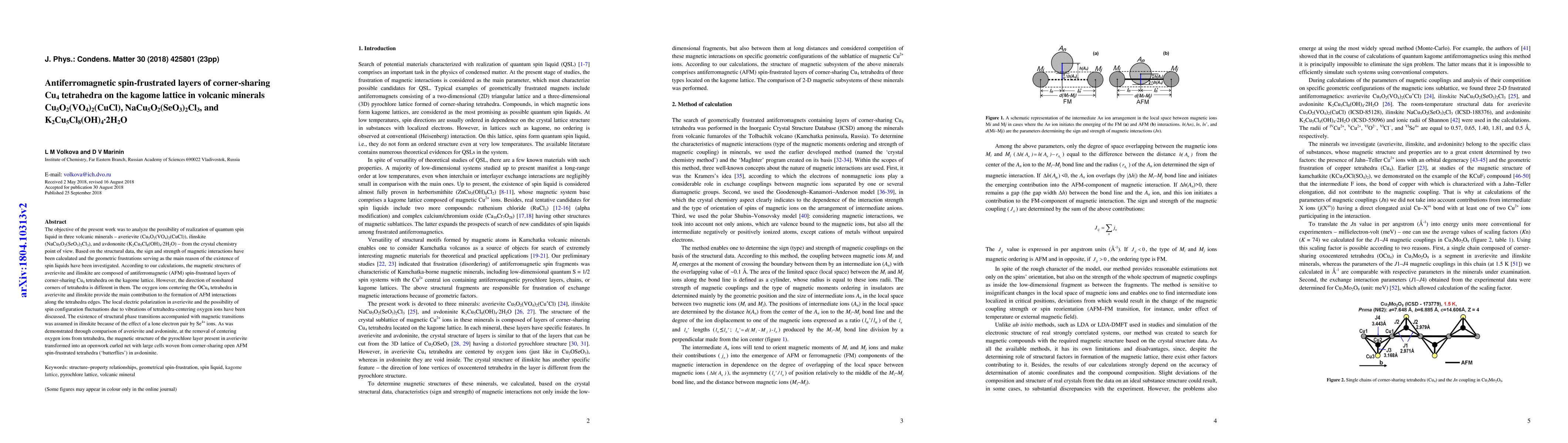 The objective of the present work was to analyze the possibility of realization of quantum spin liquid in three volcanic minerals - averievite (Cu5O2(VO4)2(CuCl)), ilinskite (NaCu5O2(SeO3)2Cl3), and avdononite (K2Cu5Cl8(OH)4 2H2O - from the crystal chemistry point of view. Based on the structural data, the sign and strength of magnetic interactions have been calculated and the geometric frustrations serving as the main reason of the existence of spin liquids have been investigated. According to our calculations, the magnetic structures of averievite and ilinskite are composed of antiferromagnetic (AFM) spin-frustrated layers of corner-sharing Cu4 tetrahedra on the kagome lattice. However, the direction of nonshared corners of tetrahedra is different in them. The oxygen ions centering the OCu4 tetrahedra in averievite and ilinskite provide the main contribution to the formation of AFM interactions along the tetrahedra edges. The local electric polarization in averievite and the possibility of spin configuration fluctuations due to vibrations of tetrahedra-centering oxygen ions have been discussed. The existence of structural phase transitions accompanied with magnetic transitions was assumed in ilinskite because of the effect of a lone electron pair by Se4+ ions. As was demonstrated through comparison of averievite and avdoninite, at the removal of centering oxygen ions from tetrahedra, the magnetic structure of the pyrochlore layer present in averievite transformed into an openwork curled net with large cells woven from corner-sharing open AFM spin-frustrated tetrahedra ('butterflies'} in avdoninite.