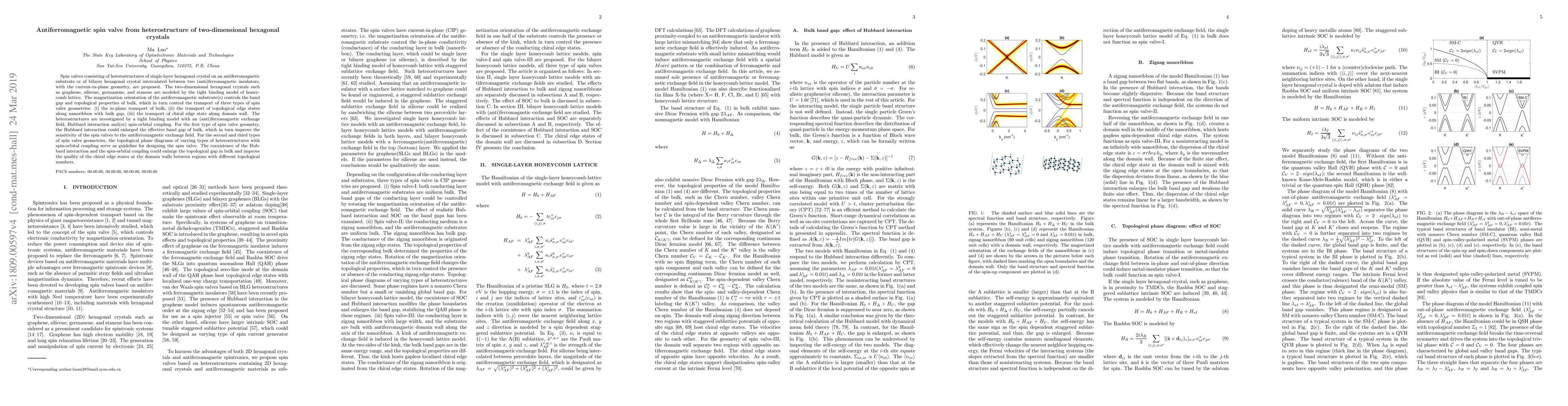 Spin valves consisting of heterostructures of single-layer hexagonal crystal on an antiferromagnetic substrate or of bilayer hexagonal crystal intercalated between two (anti)ferromagnetic insulators, with the current-in-plane geometry, are proposed. The two-dimensional hexagonal crystals such as graphene, silicene, germanene, and stanene are modeled by the tight binding model of honeycomb lattice. The magnetization orientation of the antiferromagnetic substrate(s) controls the band gap and topological properties of bulk, which in turn control the transport of three types of spin valve geometries: (i) the in-plane transport of bulk; (ii) the transport of topological edge states along nanoribbon with bulk gap; (iii) the transport of chiral edge state along domain wall. The heterostructures are investigated by a tight binding model with an (anti)ferromagnetic exchange field, Hubbard interaction and(or) spin-orbital coupling. For the first type of spin valve geometry, the Hubbard interaction could enlarged the effective band gap of bulk, which in turn improve the sensitivity of the spin valves to the antiferromagnetic exchange field. For the second and third types of spin valve geometries, the topological phase diagrams of varying types of heterostructures with spin-orbital coupling serve as guideline for designing the spin valve. The coexistence of the Hubbard interaction and the spin-orbital coupling could enlarge the topological gap in bulk and improve the quality of the chiral edge states at the domain walls between regions with different topological numbers.