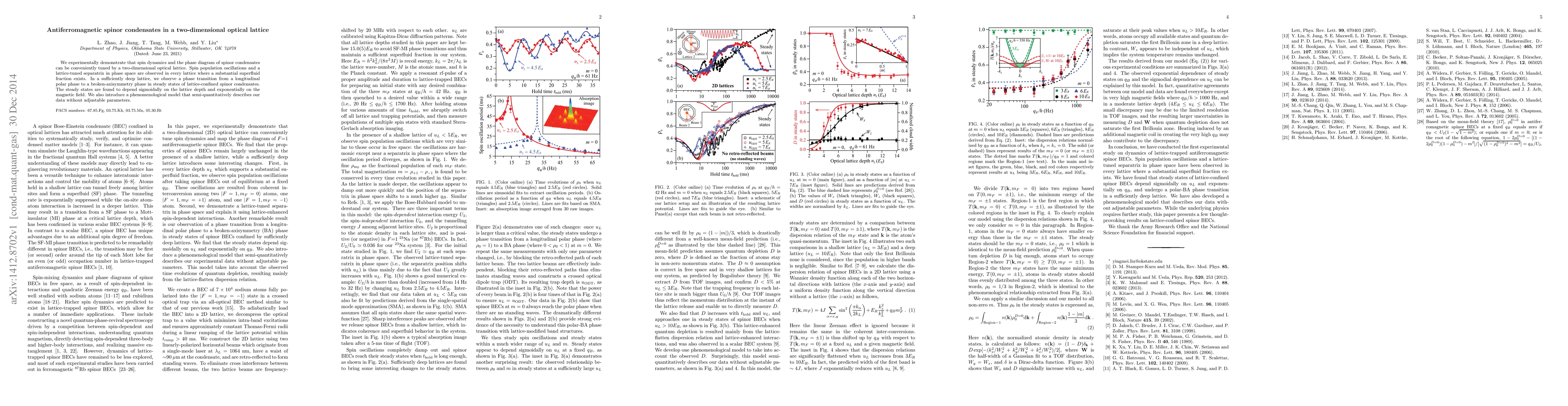 This paper demonstrates the manipulation of spin dynamics in spinor condensates using a two-dimensional optical lattice, revealing a phase transition from a longitudinal polar phase to a broken-axisymmetry phase, and introduces a phenomenological model to describe the observed phenomena.