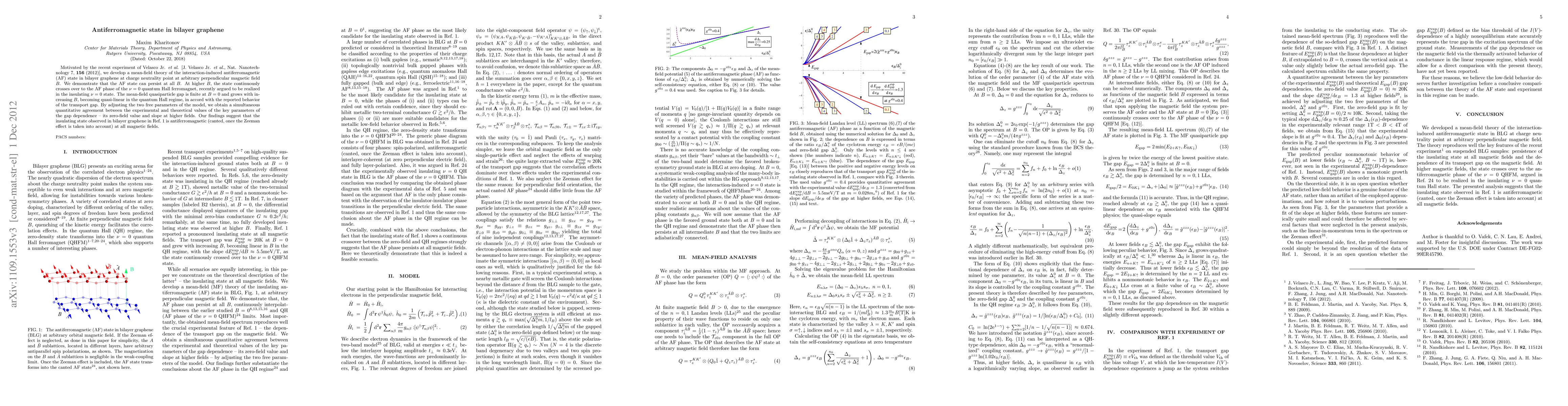 This research develops a mean-field theory to explain the antiferromagnetic state in bilayer graphene at charge neutrality under various magnetic fields, showing the state's persistence and transition to a quantum Hall ferromagnet phase at higher fields. The theoretical model accurately matches experimental observations of the quasiparticle gap, supporting the antiferromagnetic nature of the insulating state observed in bilayer graphene.