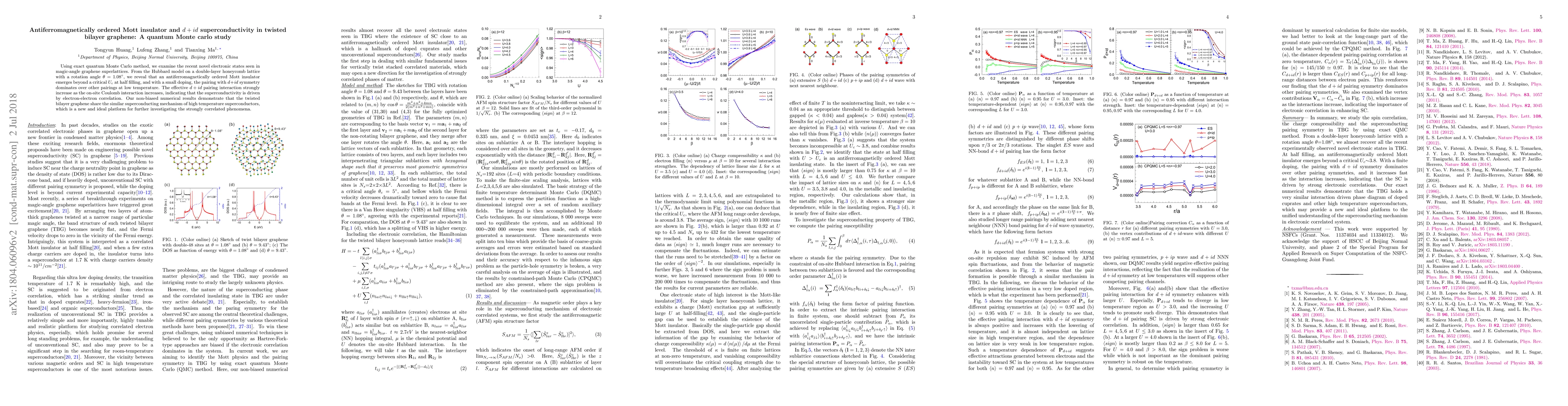 This study uses quantum Monte Carlo to explore the electronic states in twisted bilayer graphene, revealing an antiferromagnetically ordered Mott insulator phase and $d+id$ superconductivity driven by electron-electron interactions, suggesting a new platform for studying strongly correlated phenomena.