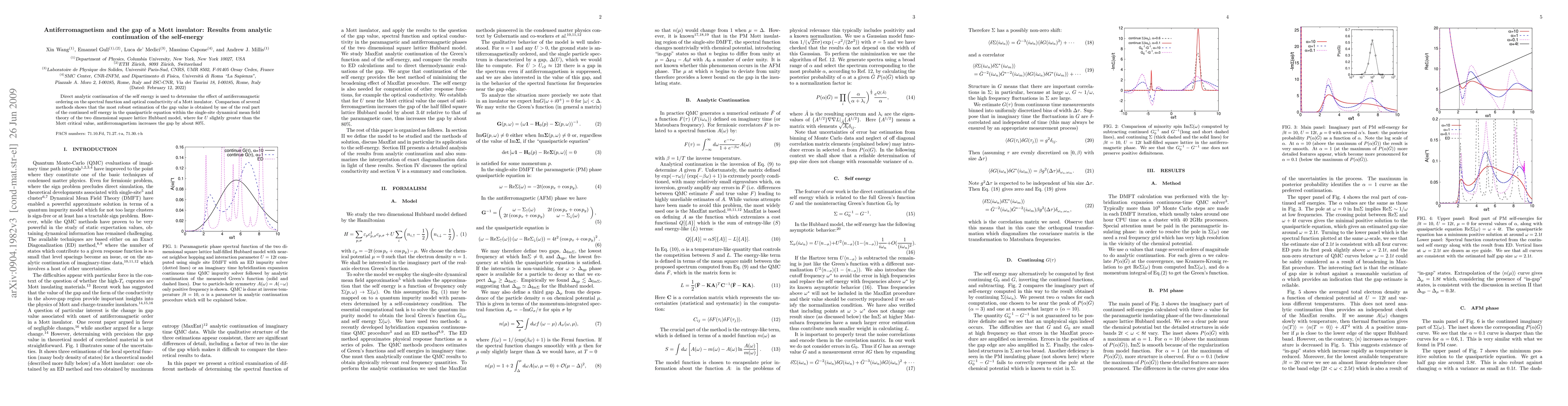 Direct analytic continuation of the self energy is used to determine the effect of antiferromagnetic ordering on the spectral function and optical conductivity of a Mott insulator. Comparison of several methods shows that the most robust estimation of the gap value is obtained by use of the real part of the continued self energy in the quasiparticle equation within the single-site dynamical mean field theory of the two dimensional square lattice Hubbard model, where for U slightly greater than the Mott critical value, antiferromagnetism increases the gap by about 80%.