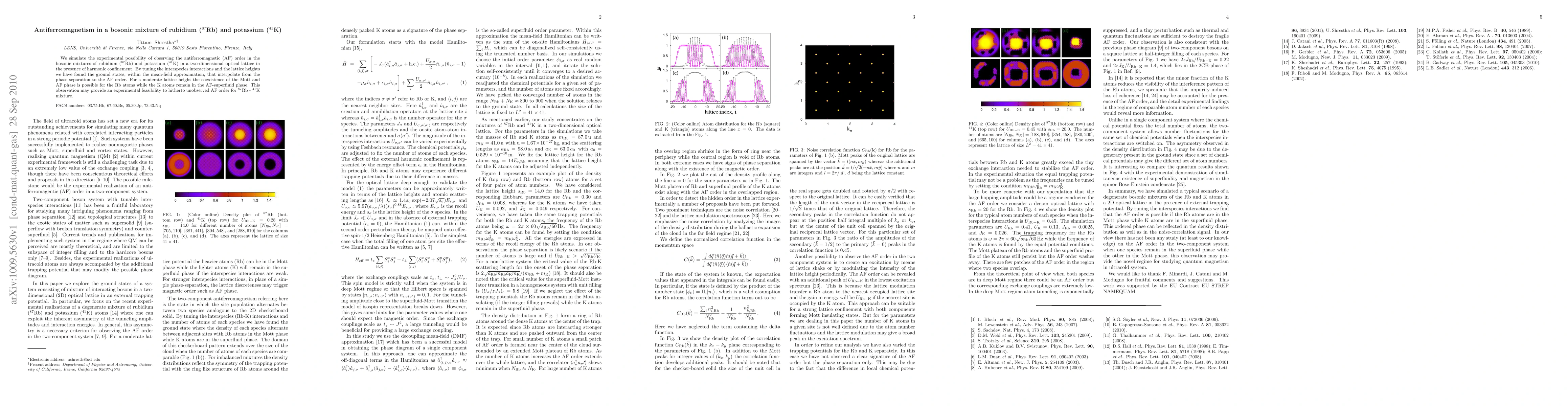 We simulate the experimental possibility of observing the antiferromagnetic (AF) order in the bosonic mixtures of rubidium ($^{87}$Rb) and potassium ($^{41}$K) in a two-dimensional optical lattice in the presence of harmonic confinement. By tuning the interspecies interactions and the lattice heights we have found the ground states, within the mean-field approximation, that interpolate from the phase separation to the AF order. For a moderate lattice height the coexistence of the Mott and AF phase is possible for the Rb atoms while the K atoms remain in the AF-superfluid phase. This observation may provide an experimental feasibility to hitherto unobserved AF order for $^{87}$Rb - $^{41}$K mixture.