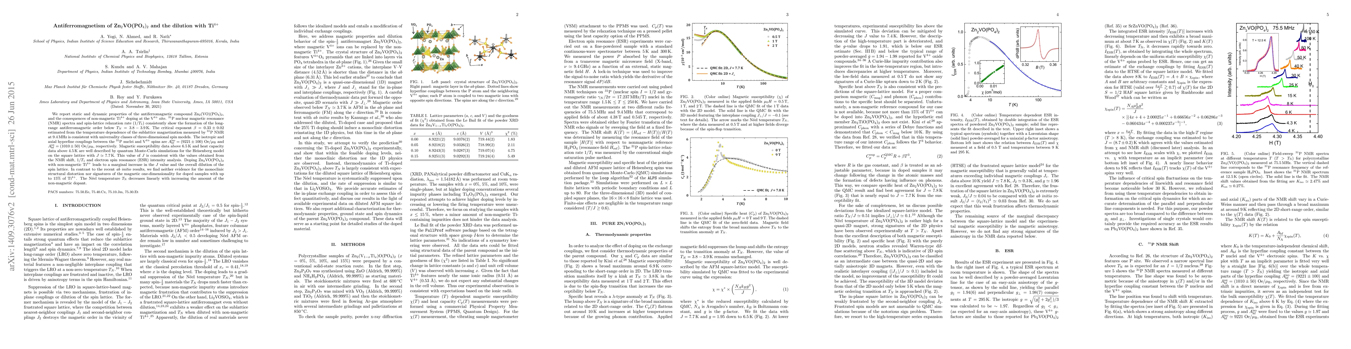 We report static and dynamic properties of the antiferromagnetic compound Zn$_{2}$(VO)(PO$_{4}$)$_{2}$, and the consequences of non-magnetic Ti$^{4+}$ doping at the V$^{4+}$ site. $^{31}$P nuclear magnetic resonance (NMR) spectra and spin-lattice relaxation rate ($1/T_1$) consistently show the formation of the long-range antiferromagnetic order below $T_N= 3.8-3.9$\,K. The critical exponent $\beta=0.33 \pm 0.02$ estimated from the temperature dependence of the sublattice magnetization measured by $^{31}$P NMR at 9.4\,MHz is consistent with universality classes of three-dimensional spin models. The isotropic and axial hyperfine couplings between the $^{31}$P nuclei and V$^{4+}$ spins are $A_{\rm hf}^{\rm iso} = (9221 \pm 100)$ Oe/$\mu_{\rm B}$ and $A_{\rm hf}^{\rm ax} = (1010 \pm 50)$ Oe/$\mu_{\rm B}$, respectively. Magnetic susceptibility data above 6.5\,K and heat capacity data above 4.5\,K are well described by quantum Monte-Carlo simulations for the Heisenberg model on the square lattice with $J\simeq 7.7$\,K. This value of $J$ is consistent with the values obtained from the NMR shift, $1/T_1$ and electron spin resonance (ESR) intensity analysis. Doping Zn$_2$VO(PO$_4)_2$ with non-magnetic Ti$^{4+}$ leads to a marginal increase in the $J$ value and the overall dilution of the spin lattice. In contrast to the recent \textit{ab initio} results, we find neither evidence for the monoclinic structural distortion nor signatures of the magnetic one-dimensionality for doped samples with up to 15\% of Ti$^{4+}$. The N\'eel temperature $T_{\rm N}$ decreases linearly with increasing the amount of the non-magnetic dopant.