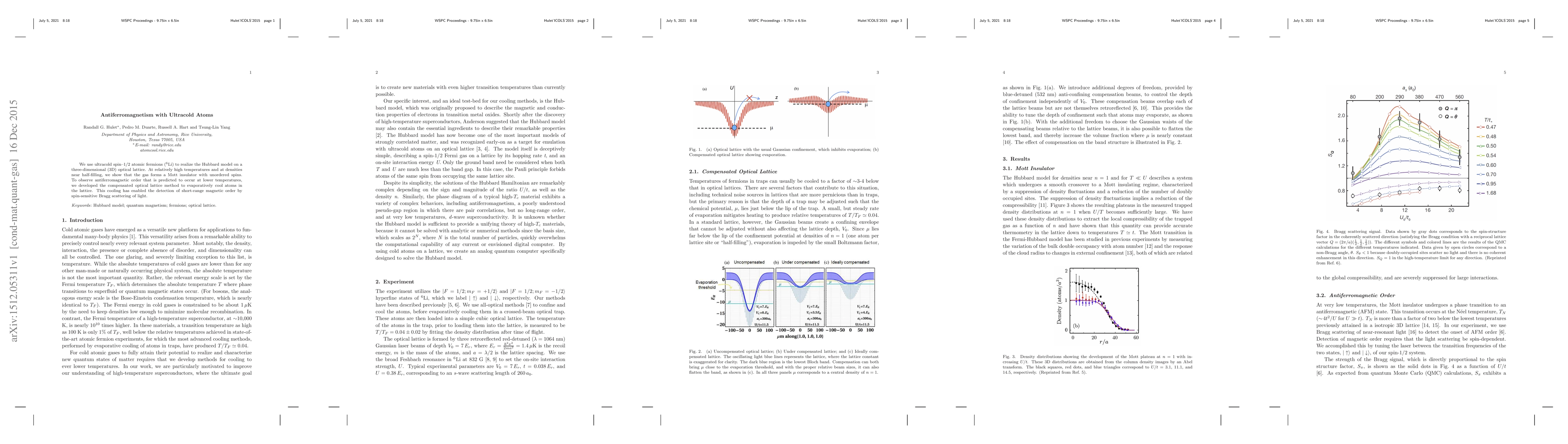 We use ultracold spin--1/2 atomic fermions ($^6$Li) to realize the Hubbard model on a three-dimensional (3D) optical lattice. At relatively high temperatures and at densities near half-filling, we show that the gas forms a Mott insulator with unordered spins. To observe antiferromagnetic order that is predicted to occur at lower temperatures, we developed the compensated optical lattice method to evaporatively cool atoms in the lattice. This cooling has enabled the detection of short-range magnetic order by spin-sensitive Bragg scattering of light.