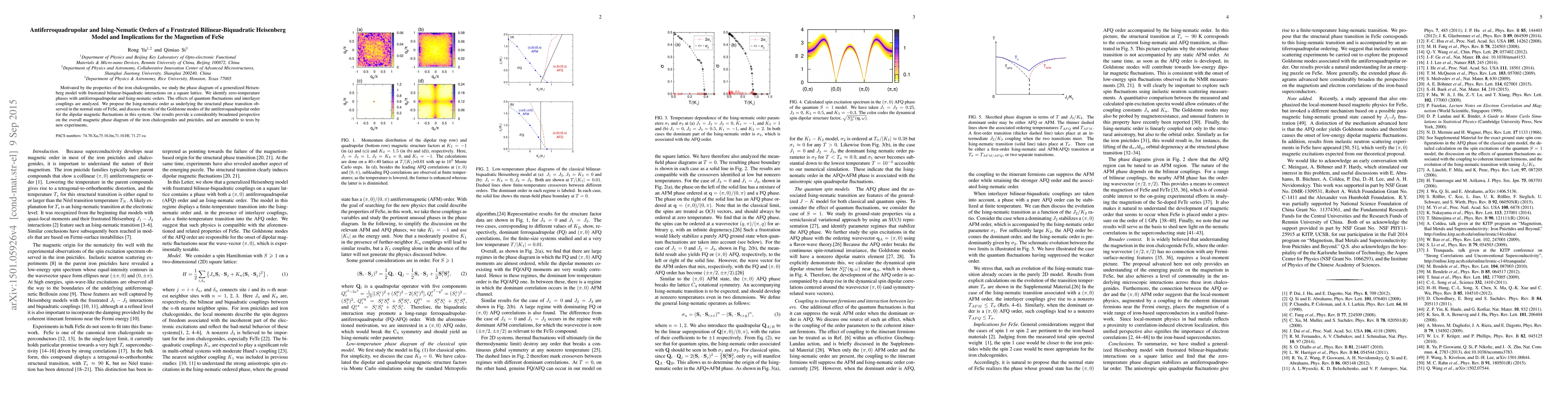 Motivated by the properties of the iron chalcogenides, we study the phase diagram of a generalized Heisenberg model with frustrated bilinear-biquadratic interactions on a square lattice. We identify zero-temperature phases with antiferroquadrupolar and Ising-nematic orders. The effects of quantum fluctuations and interlayer couplings are analyzed. We propose the Ising-nematic order as underlying the structural phase transition observed in the normal state of FeSe, and discuss the role of the Goldstone modes of the antiferroquadrupolar order for the dipolar magnetic fluctuations in this system. Our results provide a considerably broadened perspective on the overall magnetic phase diagram of the iron chalcogenides and pnictides, and are amenable to tests by new experiments.