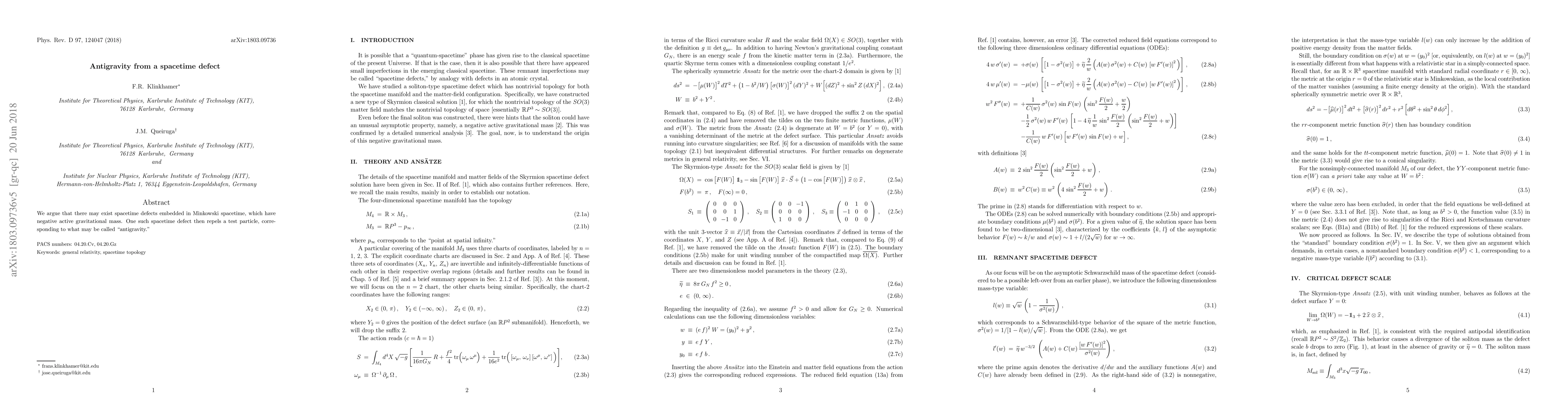 The paper proposes the existence of spacetime defects in Minkowski spacetime with negative active gravitational mass, potentially causing antigravity by repelling test particles.