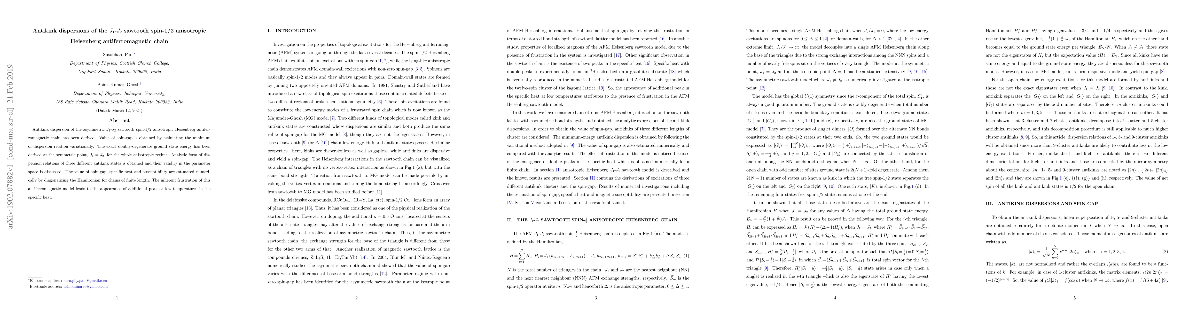 This paper derives the antikink dispersions for the $J_1$-$J_2$ sawtooth spin-1/2 anisotropic Heisenberg antiferromagnetic chain, obtaining the spin-gap and exact ground state energy. It also analytically determines the dispersion relations for three antikink states and numerically estimates spin-gap, specific heat, and susceptibility, revealing additional low-temperature peaks due to inherent frustration.