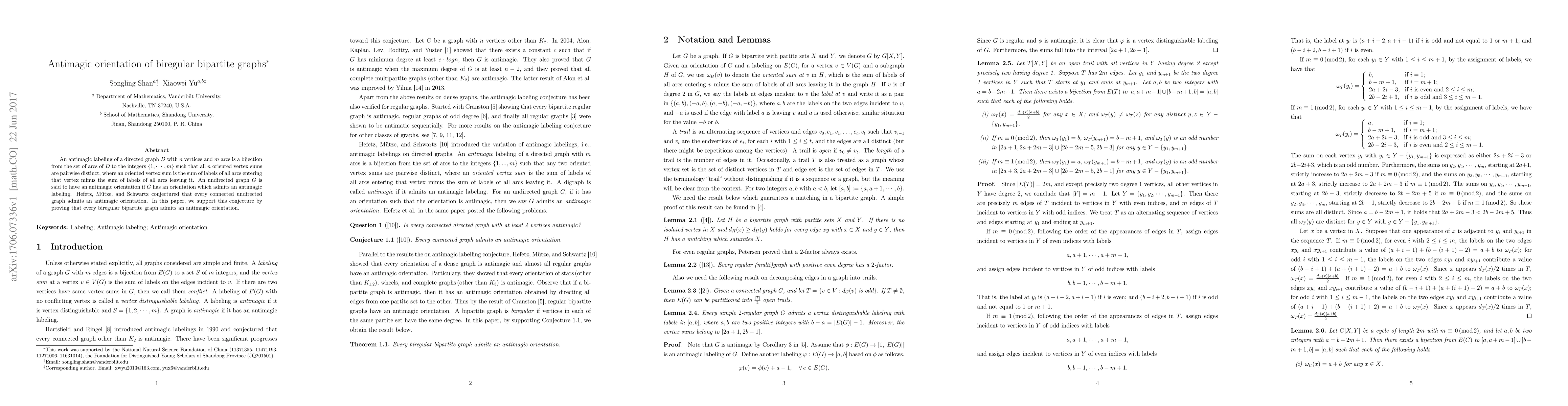 This paper proves that every biregular bipartite graph possesses an antimagic orientation, supporting the conjecture that all connected undirected graphs can be oriented to achieve an antimagic labeling. An antimagic orientation ensures distinct oriented vertex sums for all vertices.