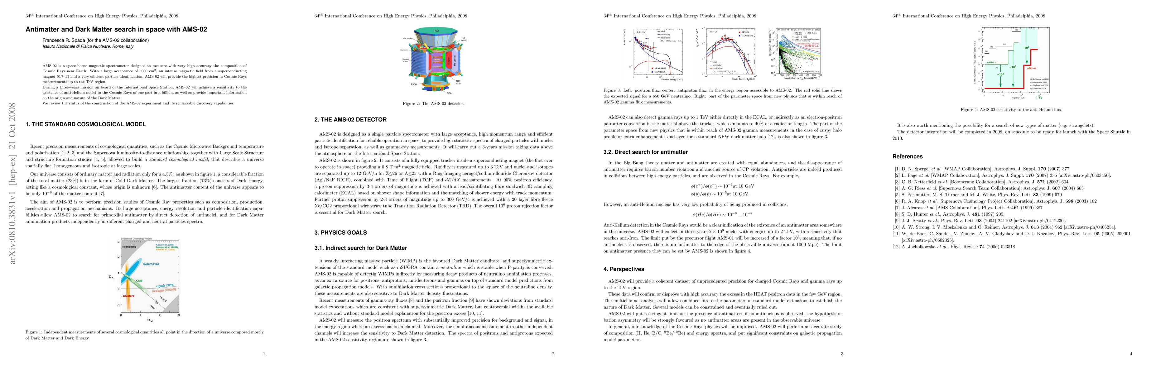 AMS-02, a high-precision space-borne magnetic spectrometer, aims to detect antimatter and investigate dark matter through detailed cosmic ray measurements. Its mission on the International Space Station will search for anti-Helium nuclei and contribute to understanding dark matter.
