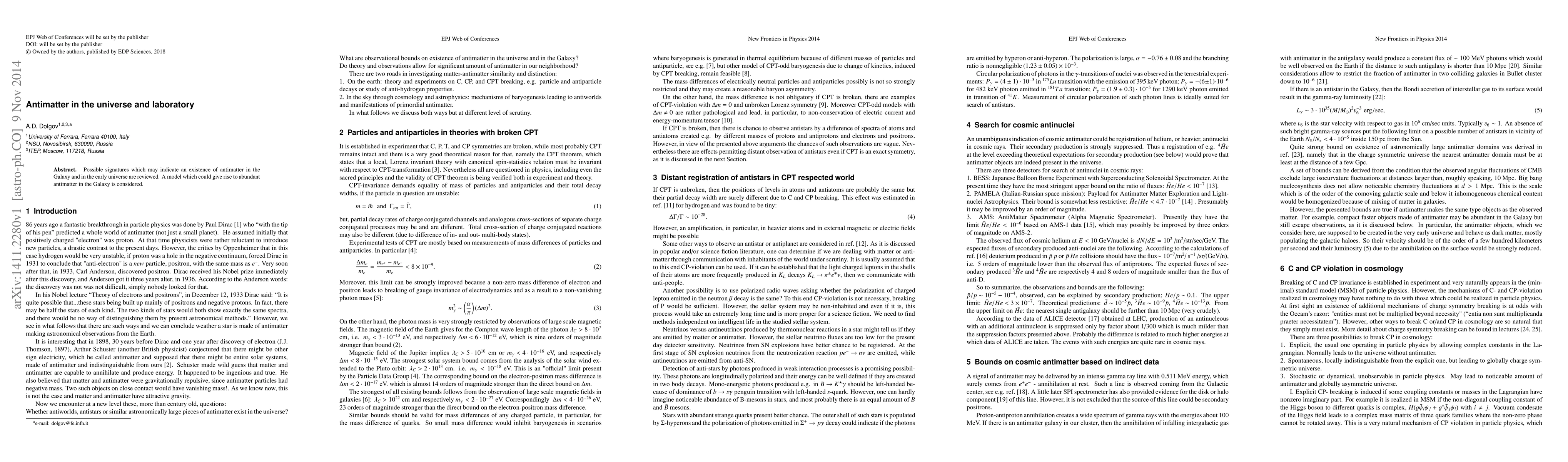 Summary: This paper reviews potential indicators of antimatter presence in the Galaxy and early universe, and explores a theoretical model that could explain the abundance of antimatter in the Galaxy.