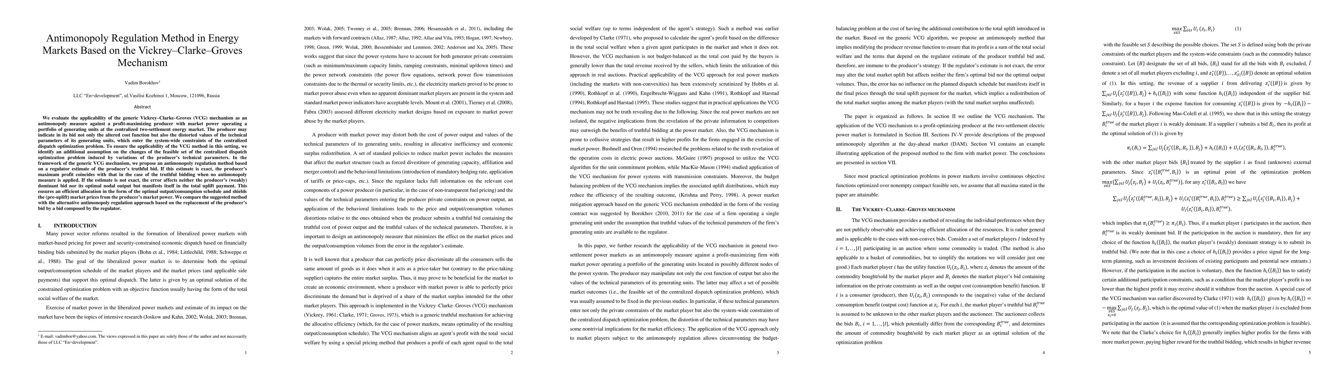 This paper evaluates the Vickrey-Clarke-Groves mechanism as an antimonopoly tool against a profit-maximizing producer with market power in a centralized energy market. The proposed method ensures truthful bidding and efficient allocation, while shielding market prices from the producer's market power, compared to an alternative regulator-composed bid approach.