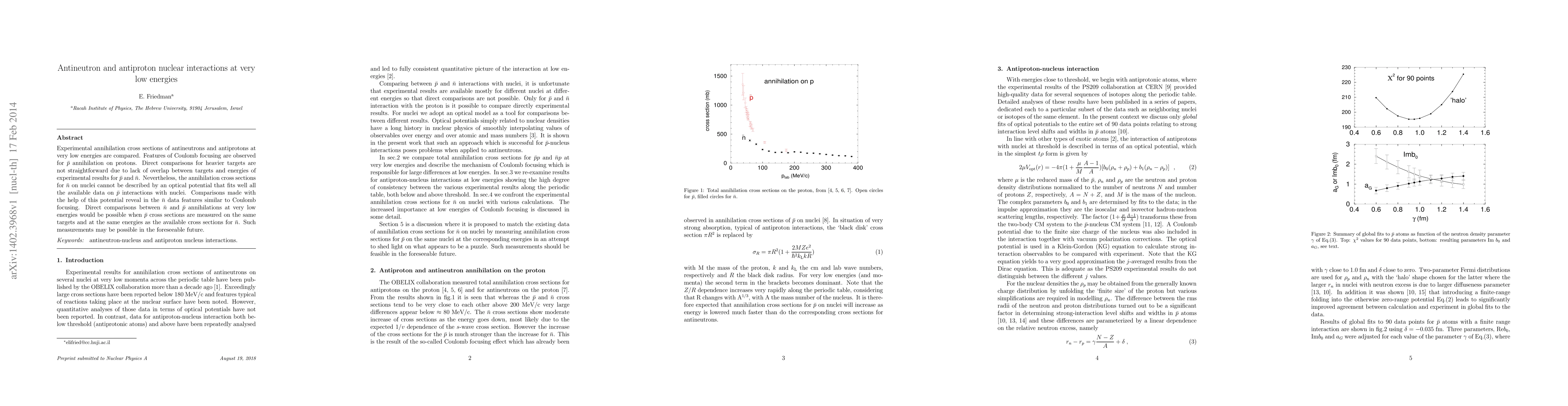 Experimental annihilation cross sections of antineutrons and antiprotons at very low energies are compared. Features of Coulomb focusing are observed for $\bar p$ annihilation on protons. Direct comparisons for heavier targets are not straightforward due to lack of overlap between targets and energies of experimental results for $\bar p$ and $\bar n$. Nevertheless, the annihilation cross sections for $\bar n$ on nuclei cannot be described by an optical potential that fits well all the available data on $\bar p$ interactions with nuclei. Comparisons made with the help of this potential reveal in the $\bar n$ data features similar to Coulomb focusing. Direct comparisons between $\bar n$ and $\bar p$ annihilations at very low energies would be possible when $\bar p$ cross sections are measured on the same targets and at the same energies as the available cross sections for $\bar n$. Such measurements may be possible in the foreseeable future.