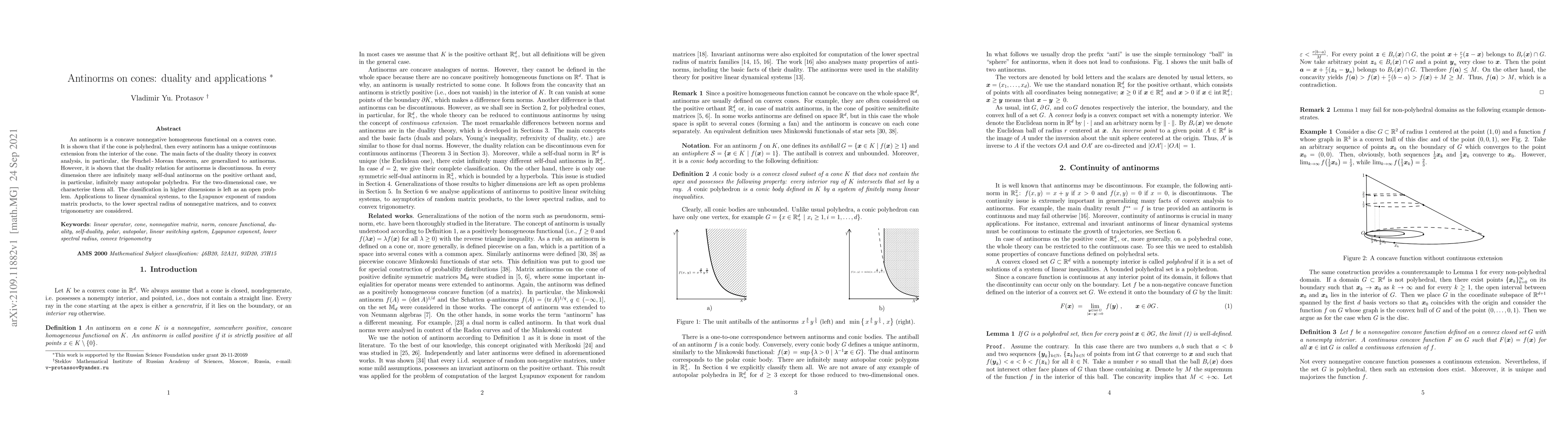 An antinorm is a concave nonnegative homogeneous functional on a convex cone. It is shown that if the cone is polyhedral, then every antinorm has a unique continuous extension from the interior of the cone. The main facts of the duality theory in convex analysis, in particular, the Fenchel-Moreau theorem, are generalized to antinorms. However, it is shown that the duality relation for antinorms is discontinuous. In every dimension there are infinitely many self-dual antinorms on the positive orthant and, in particular, infinitely many autopolar polyhedra. For the two-dimensional case, we characterise them all. The classification in higher dimensions is left as an open problem. Applications to linear dynamical systems, to the Lyapunov exponent of random matrix products, to the lower spectral radius of nonnegative matrices, and to convex trigonometry are considered.