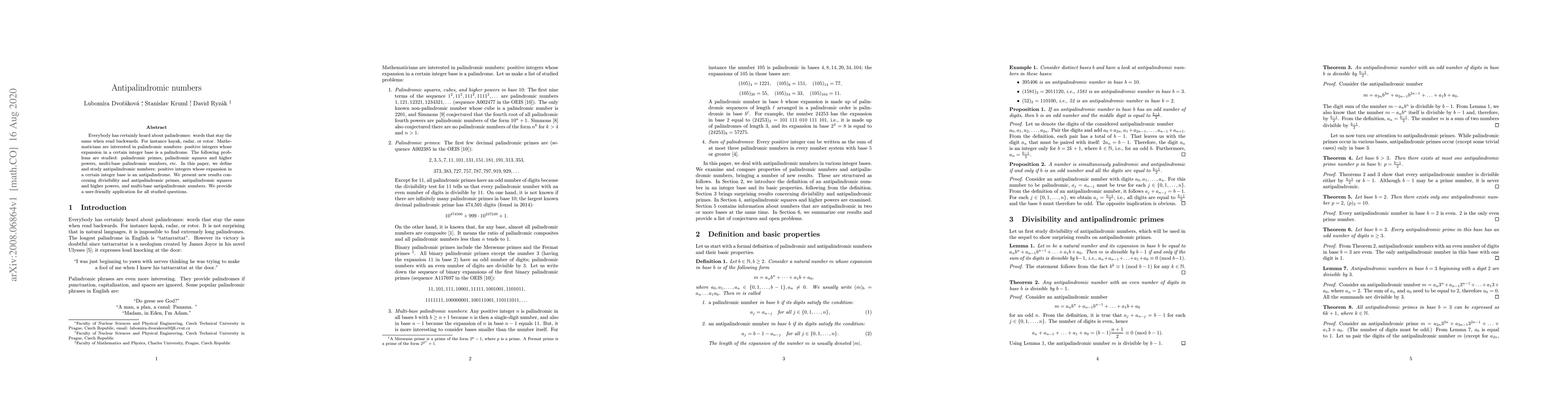 Everybody has certainly heard about palindromes: words that stay the same when read backwards. For instance kayak, radar, or rotor. Mathematicians are interested in palindromic numbers: positive integers whose expansion in a certain integer base is a palindrome. The following problems are studied: palindromic primes, palindromic squares and higher powers, multibased palindromic numbers, etc. In this paper, we define and study antipalindromic numbers: positive integers whose expansion in a certain integer base is an antipalindrome. We present new results concerning divisibility and antipalindromic primes, antipalindromic squares and higher powers, and multibased antipalindromic numbers. We provide a user-friendly application for all studied questions.