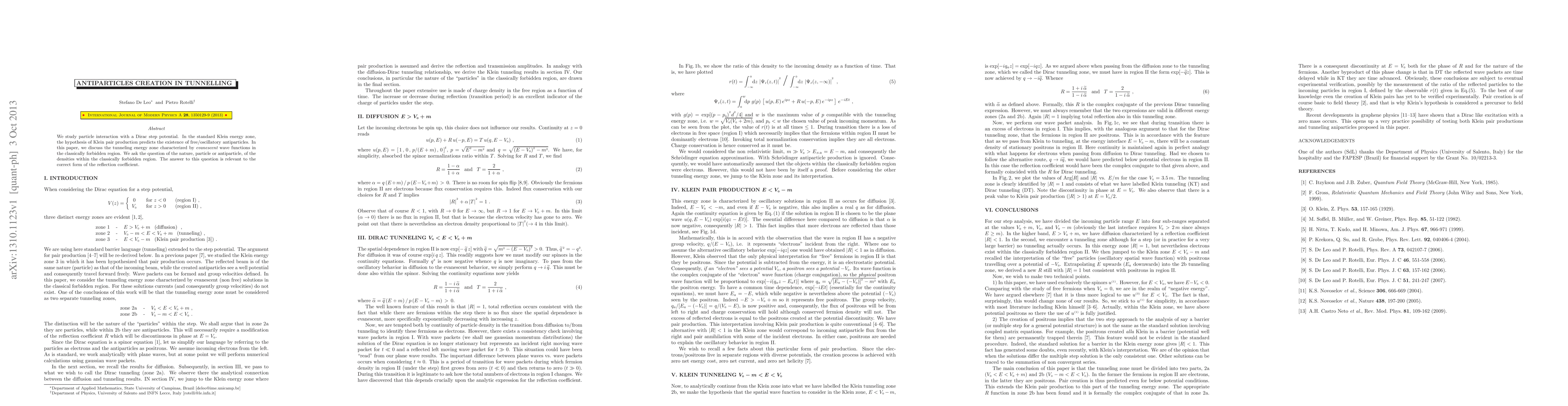 We study particle interaction with a Dirac step potential. In the standard Klein energy zone, the hypothesis of Klein pair production predicts the existence of free/oscillatory antiparticles. In this paper, we discuss the tunneling energy zone characterized by evanescent wave functions in the classically forbidden region. We ask the question of the nature, particle or antiparticle, of the densities within the classically forbidden region. The answer to this question is relevant to the correct form of the reflection coefficient.