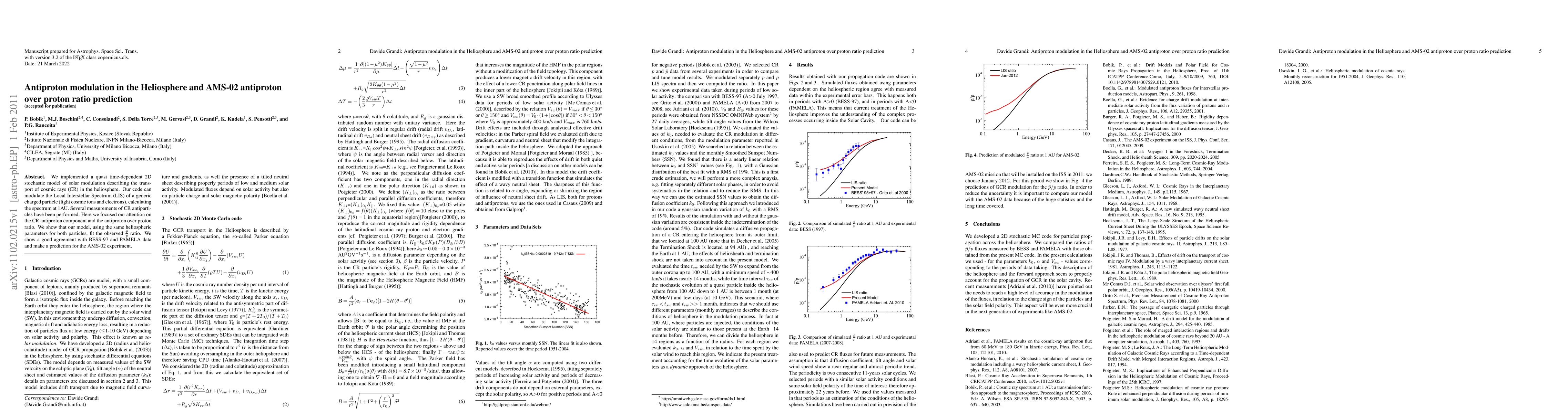 We implemented a quasi time-dependent 2D stochastic model of solar modulation describing the transport of cosmic rays (CR) in the heliosphere. Our code can modulate the Local Interstellar Spectrum (LIS) of a generic charged particle (light cosmic ions and electrons), calculating the spectrum at 1AU. Several measurements of CR antiparticles have been performed. Here we focused our attention on the CR antiproton component and the antiproton over proton ratio. We show that our model, using the same heliospheric parameters for both particles, fit the observed anti-p/p ratio. We show a good agreement with BESS-97 and PAMELA data and make a prediction for the AMS-02 experiment.