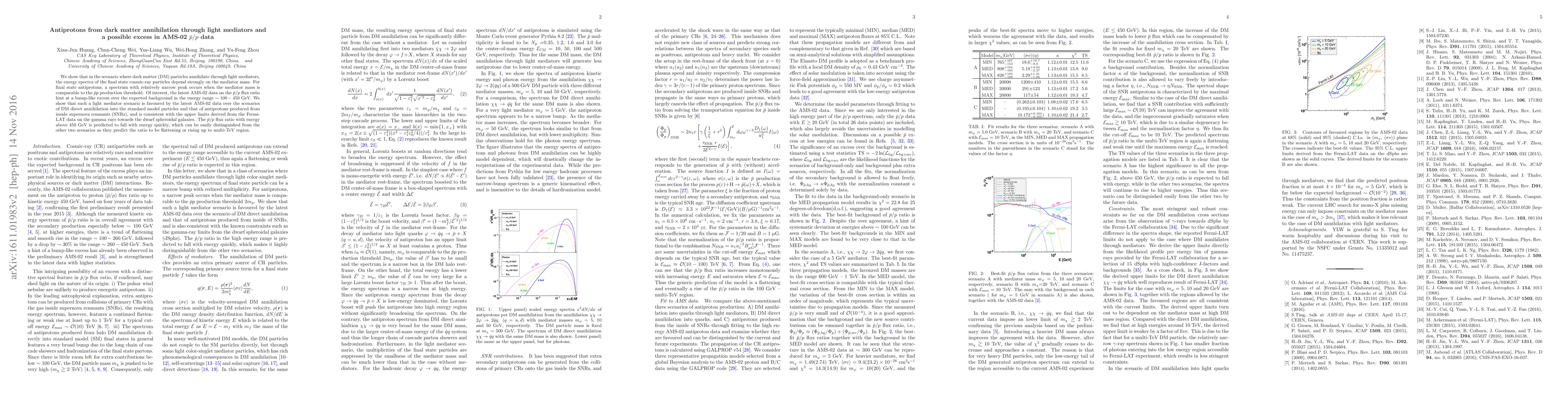 We show that in the scenario where dark matter (DM) particles annihilate through light mediators, the energy spectra of the final state cosmic-ray particles depend strongly on the mediator mass. For final state antiprotons, a spectrum with relatively narrow peak occurs when the mediator mass is comparable to the $\pbar p$ production threshold. Of interest, the latest AMS-02 data on the $\pbar/p$ flux ratio hint at a bump-like excess over the expected background in the energy range $\sim100-450$ GeV. We show that such a light mediator scenario is favoured by the latest AMS-02 data over the scenarios of DM direct annihilation into the standard model particles and that of antiprotons produced from inside supernova remnants (SNRs), and is consistent with the upper limits derived from the Fermi-LAT data on the gamma rays towards the dwarf spheroidal galaxies. The $\pbar/p$ flux ratio with energy above 450 GeV is predicted to fall with energy quickly, which can be easily distinguished from the other two scenarios as they predict the ratio to be flattening or rising up to multi-TeV region.