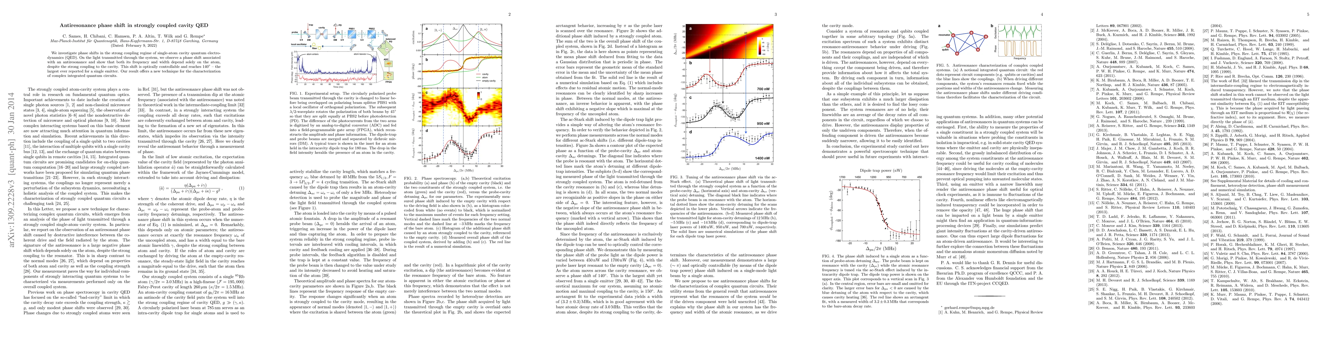 This study reveals a significant antiresonance phase shift in single-atom cavity QED under strong coupling, demonstrating that the shift's frequency and width depend on the atom alone. The optically controllable phase shift reaches 140 degrees, providing a novel method for characterizing integrated quantum circuits.