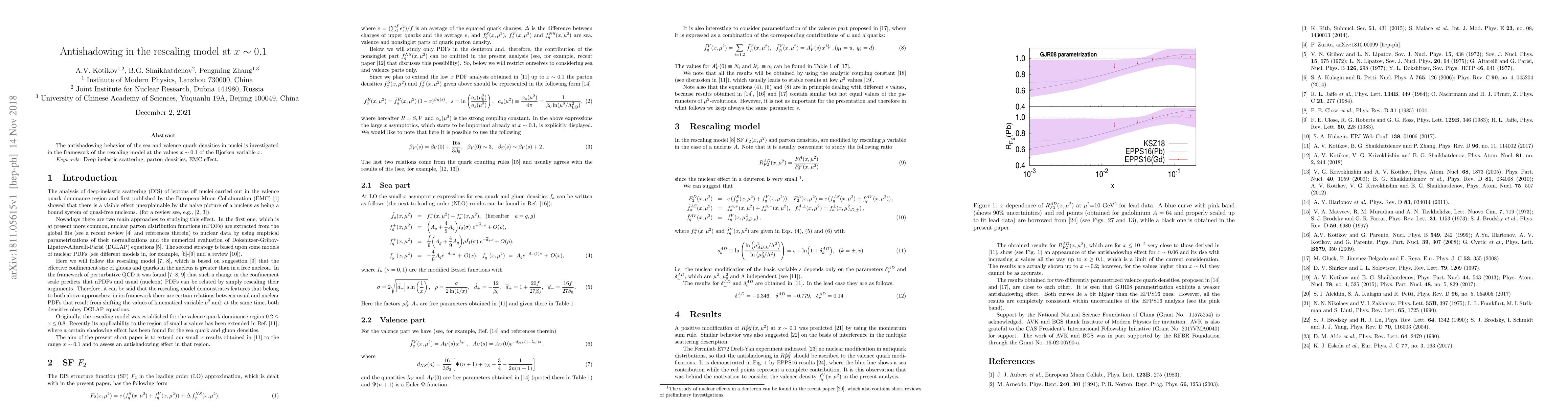 The antishadowing behavior of the sea and valence quark densities in nuclei is investigated in the framework of the rescaling model at the values x ~ 0.1 of the Bjorken variable x.