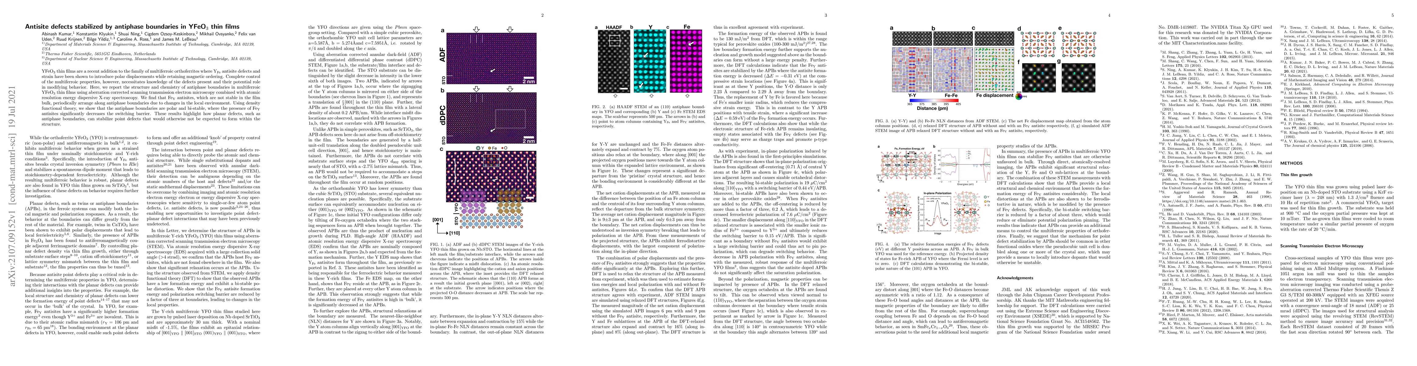 YFeO$_3$ thin films are a recent addition to the family of multiferroic orthoferrites where Y\textsubscript{Fe} antisite defects and strain have been shown to introduce polar displacements while retaining magnetic properties. Complete control of the multiferroic properties, however, necessitates knowledge of the defects present and their potential role in modifying behavior. Here, we report the structure and chemistry of antiphase boundaries in multiferroic YFeO$_3$ thin films using aberration corrected scanning transmission electron microscopy combined with atomic resolution energy dispersive X-ray spectroscopy. We find that Fe\textsubscript{Y} antisites, which are not stable in the film bulk, periodically arrange along antiphase boundaries due to changes in the local environment. Using density functional theory, we show that the antiphase boundaries are polar and bi-stable, where the presence of Fe\textsubscript{Y} antisites significantly decreases the switching barrier. These results highlight how planar defects, such as antiphase boundaries, can stabilize point defects that would otherwise not be expected to form within the structure.
