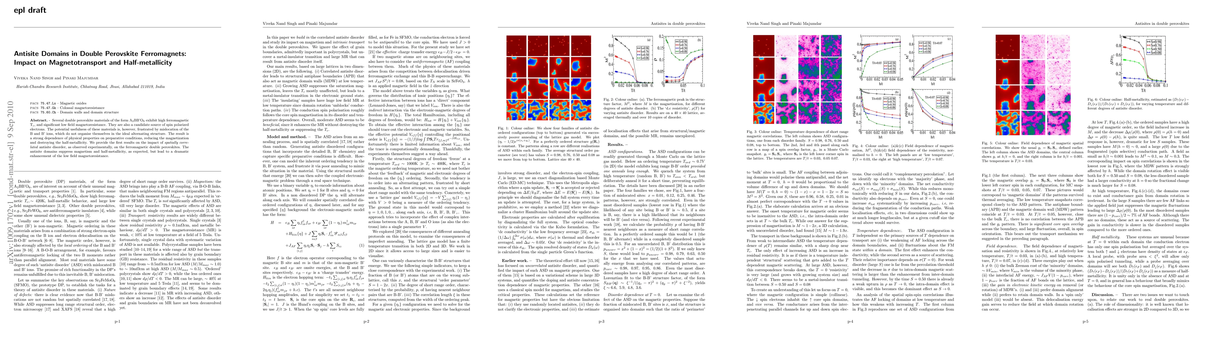 Several double perovskite materials of the form A_2BB'O_6 exhibit high ferromagnetic T_c, and significant low field magnetoresistance. They are also a candidate source of spin polarized electrons. The potential usefulness of these materials is, however, frustrated by mislocation of the B and B' ions, which do not organise themselves in the ideal alternating structure. The result is a strong dependence of physical properties on preparative conditions, reducing the magnetization and destroying the half-metallicity. We provide the first results on the impact of spatially correlated antisite disorder, as observed experimentally, on the ferromagnetic double perovskites. The antisite domains suppress magnetism and half-metallicity, as expected, but lead to a dramatic enhancement of the low field magnetoresistance.