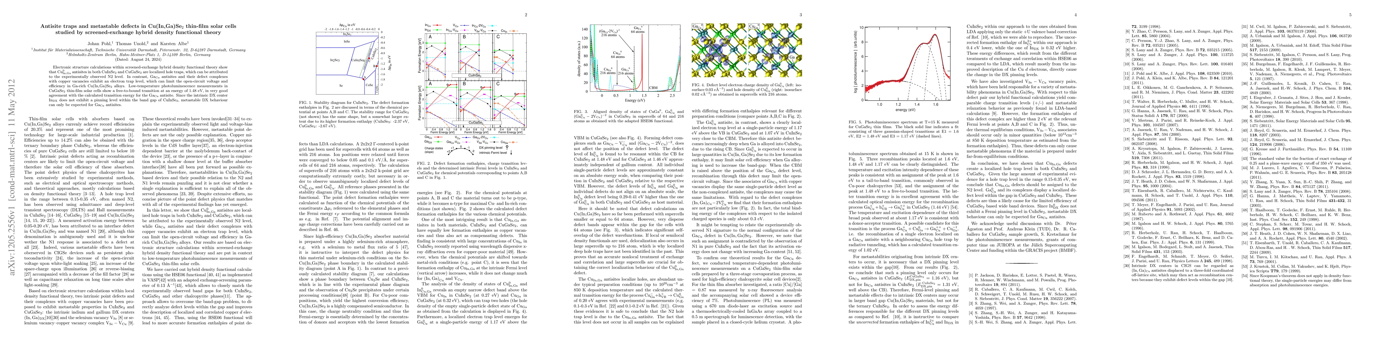 This study reveals that Cu(In,Ga) antisites in CuInSe2 and CuGaSe2 act as localized hole traps, while GaCu antisites function as electron traps, potentially limiting solar cell efficiency. The findings are corroborated by low-temperature photoluminescence measurements.