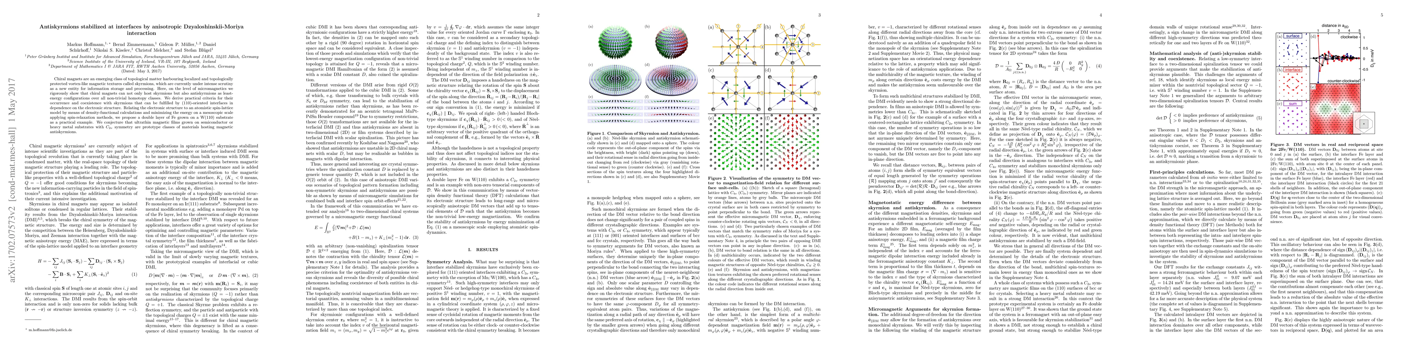 This paper explores the stabilization of antiskyrmions in chiral magnets at interfaces through anisotropic Dzyaloshinskii-Moriya interaction, demonstrating that such materials can host both skyrmions and antiskyrmions. It proposes a double layer of Fe on W(110) as a practical example for hosting magnetic antiskyrmions.