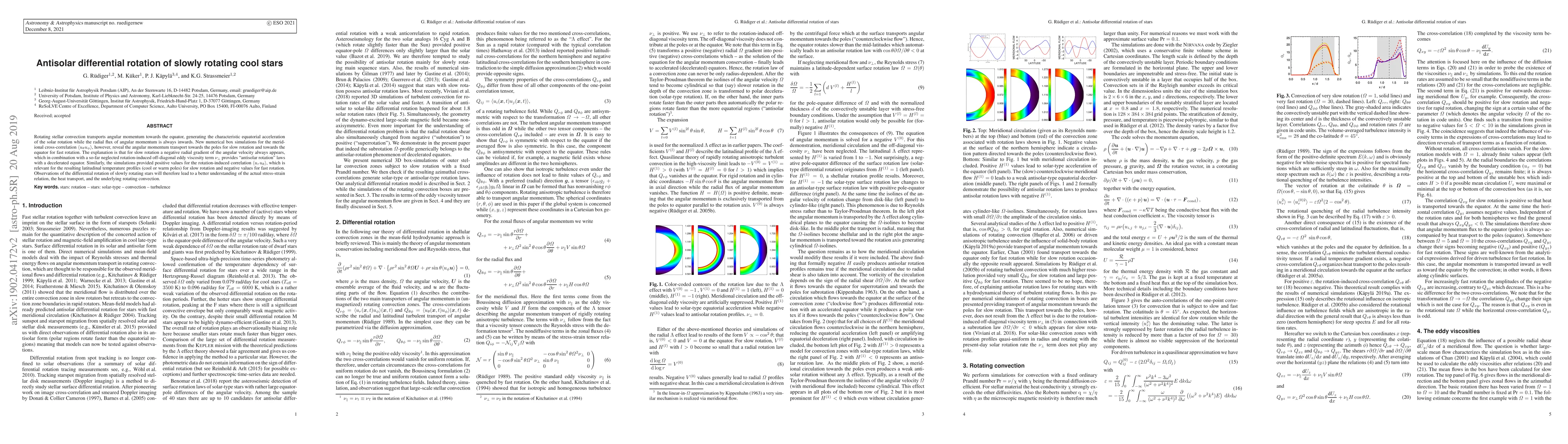 This paper investigates the differential rotation in slowly rotating cool stars, revealing that slow rotation induces an "antisolar rotation" pattern where angular momentum is transported towards the poles, contrasting with the solar equatorial acceleration. This phenomenon is explained by a negative radial gradient of angular velocity and a rotation-induced off-diagonal eddy viscosity term.