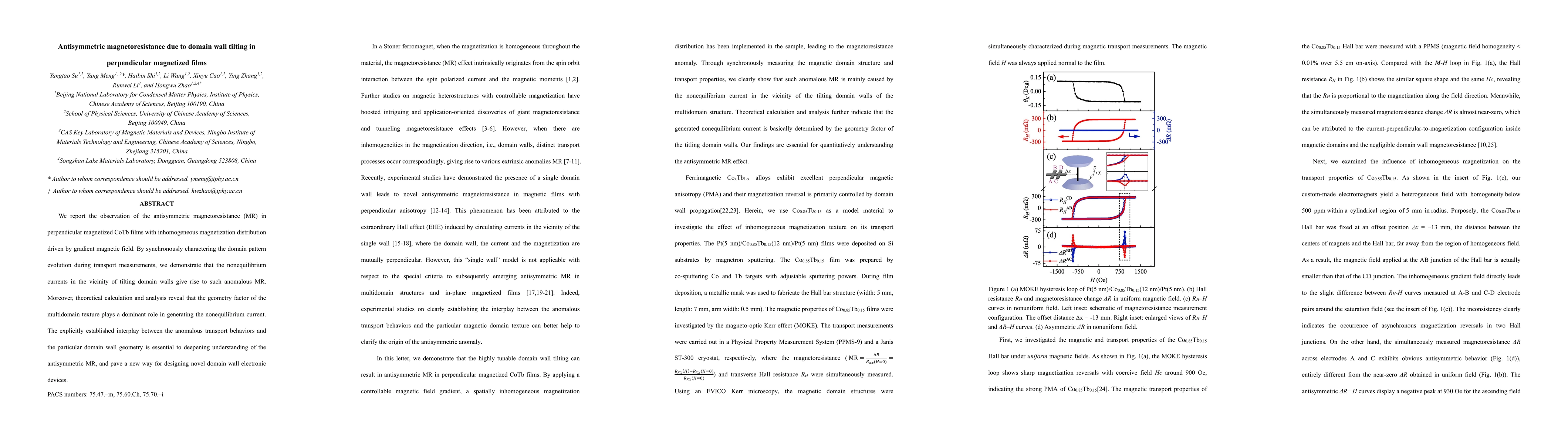 We report the observation of the antisymmetric magnetoresistance (MR) in perpendicular magnetized CoTb films with inhomogeneous magnetization distribution driven by gradient magnetic field. By synchronously charactering the domain pattern evolution during transport measurements, we demonstrate that the nonequilibrium currents in the vicinity of tilting domain walls give rise to such anomalous MR. Moreover, theoretical calculation and analysis reveal that the geometry factor of the multidomain texture plays a dominant role in generating the nonequilibrium current. The explicitly established interplay between the anomalous transport behaviors and the particular domain wall geometry is essential to deepening understanding of the antisymmetric MR, and pave a new way for designing novel domain wall electronic devices.