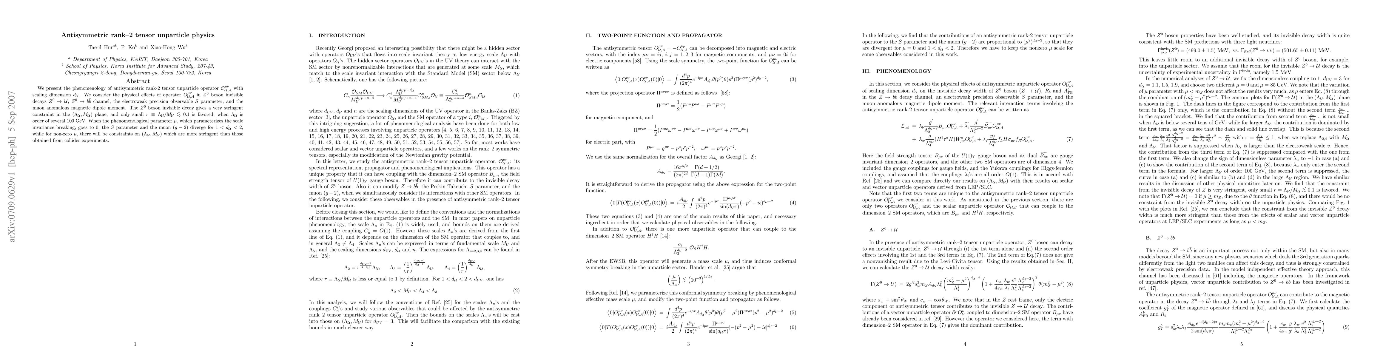 We present the phenomenology of antisymmetric rank-2 tensor unparticle operator ${\cal O}_{\cal U,A}^{\mu\nu}$ with scaling dimension $d_{\cal U}$. We consider the physical effects of operator $O_{\cal U,A}^{\mu\nu}$ in $Z^0$ boson invisible decays $Z^0 \to {\cal U}$, $Z^0 \to b \bar{b}$ channel, the electroweak precision observable $S$ parameter, and the muon anomalous magnetic dipole moment. The $Z^0$ boson invisible decay gives a very stringent constraint in the $(\Lambda_{\cal U}, M_{\cal U})$ plane, and only small $r \equiv \Lambda_{\cal U} / M_{\cal U} \lesssim 0.1$ is favored, when $\Lambda_{\cal U}$ is order of several 100 GeV. When the phenomenological parameter $\mu$, which parameterizes the scale invariance breaking, goes to 0, the $S$ parameter and the muon $(g-2)$ diverge for $1 < d_{\cal U} < 2$, while for non-zero $\mu$, there will be constraints on $(\Lambda_{\cal U}, M_{\cal U})$ which are more stringent than those obtained from collider experiments.