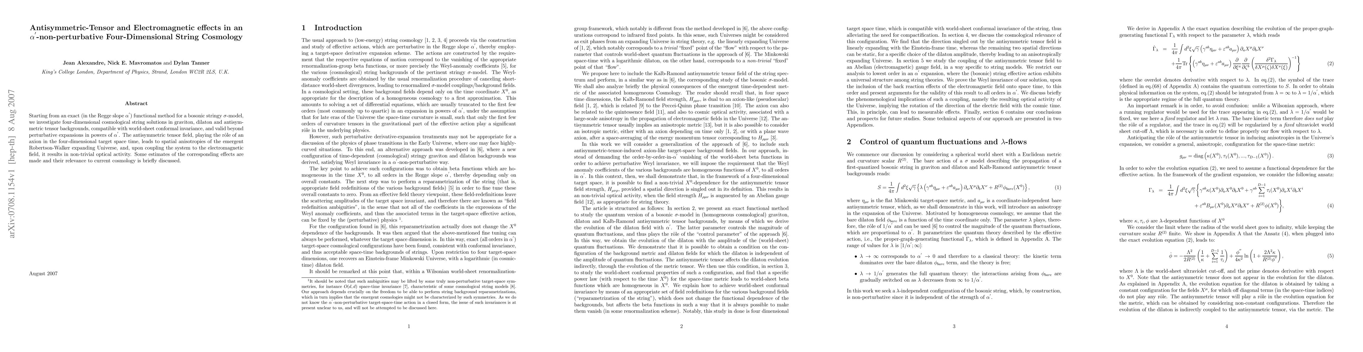 Starting from an exact (in the Regge slope alpha') functional method for a bosonic stringy sigma-model, we investigate four-dimensional cosmological string solutions in graviton, dilaton and antisymmetric tensor backgrounds, compatible with world-sheet conformal invariance, and valid beyond perturbative expansions in powers of alpha'. The antisymmetric tensor field, playing the role of an axion in the four-dimensional target space time, leads to spatial anisotropies of the emergent Robertson-Walker expanding Universe, and, upon coupling the system to the electromagnetic field, it results in non-trivial optical activity. Some estimates of the corresponding effects are made and their relevance to current cosmology is briefly discussed.