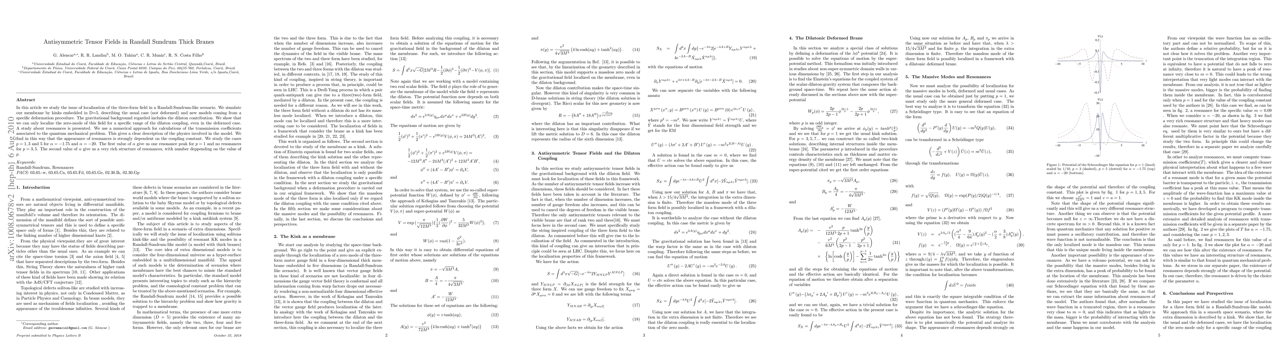 In this article we study the issue of localization of the three-form field in a Randall-Sundrum-like scenario. We simulate our membrane by kinks embedded in D=5, describing the usual case (not deformed) and new models coming from a specific deformation procedure. The gravitational background regarded includes the dilaton contribution. We show that we can only localize the zero-mode of this field for a specific range of the dilaton coupling, even in the deformed case. A study about resonances is presented. We use a numerical approach for calculations of the transmission coefficients associated to the quantum mechanical problem. This gives a clear description of the physics involved in the model. We find in this way that the appearance of resonances is strongly dependent on the coupling constant. We study the cases $p=1,3$ and 5 for $\alpha=-1.75$ and $\alpha=-20$. The first value of $\alpha$ give us one resonance peak for $p=1$ and no resonances for $p=3,5$. The second value of $\alpha$ give us a very rich structure of resonances, with number deppending on the value of $p$.