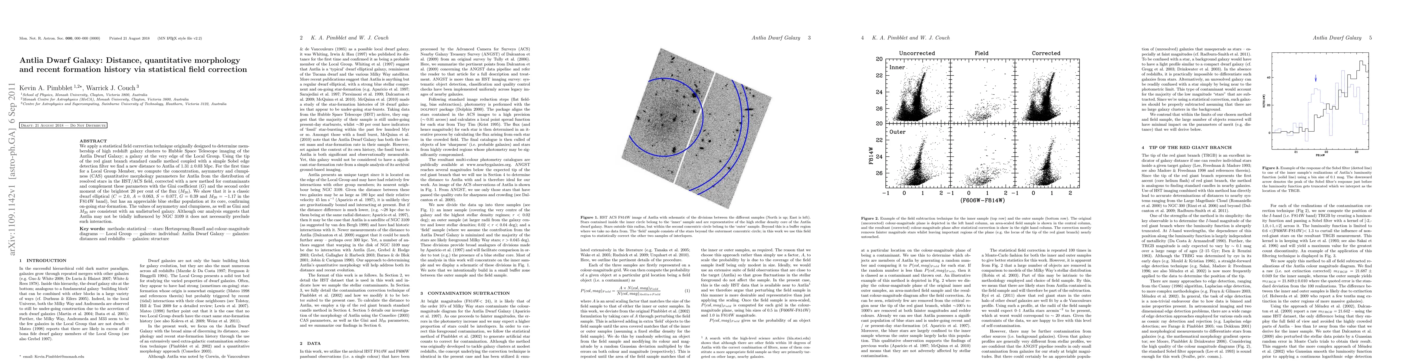We apply a statistical field correction technique originally designed to determine membership of high redshift galaxy clusters to Hubble Space Telescope imaging of the Antlia Dwarf Galaxy; a galaxy at the very edge of the Local Group. Using the tip of the red giant branch standard candle method coupled with a simple Sobel edge detection filter we find a new distance to Antlia of 1.31 +/- 0.03 Mpc. For the first time for a Local Group Member, we compute the concentration, asymmetry and clumpiness (CAS) quantitative morphology parameters for Antlia from the distribution of resolved stars in the HST/ACS field, corrected with a new method for contaminants and complement these parameters with the Gini coefficient (G) and the second order moment of the brightest 20 per cent of the flux (M_20). We show that it is a classic dwarf elliptical (C = 2.0, A = 0.063, S = 0.077, G = 0.39 and M_20 = -1.17 in the F814W band), but has an appreciable blue stellar population at its core, confirming on-going star-formation. The values of asymmetry and clumpiness, as well as Gini and M_20 are consistent with an undisturbed galaxy. Although our analysis suggests that Antlia may not be tidally influenced by NGC 3109 it does not necessarily preclude such interaction.