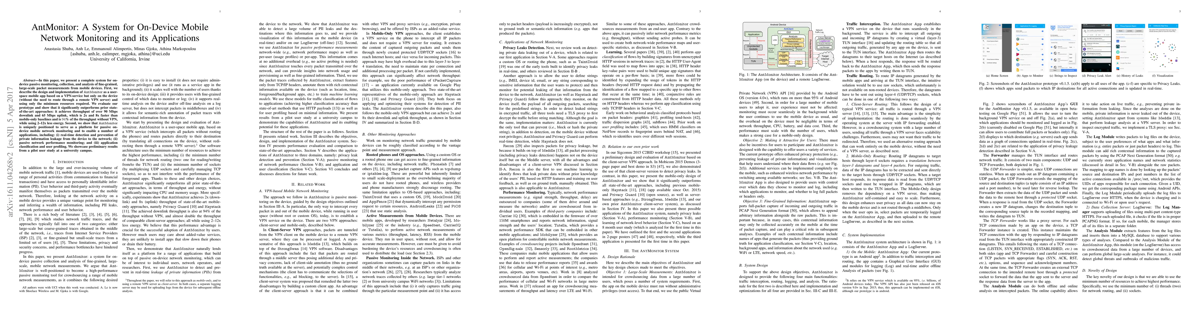 AntMonitor is an on-device mobile network monitoring system that significantly outperforms existing methods by achieving high throughput with minimal energy use. It enables applications like real-time private information leakage detection, network performance monitoring, and user profiling.