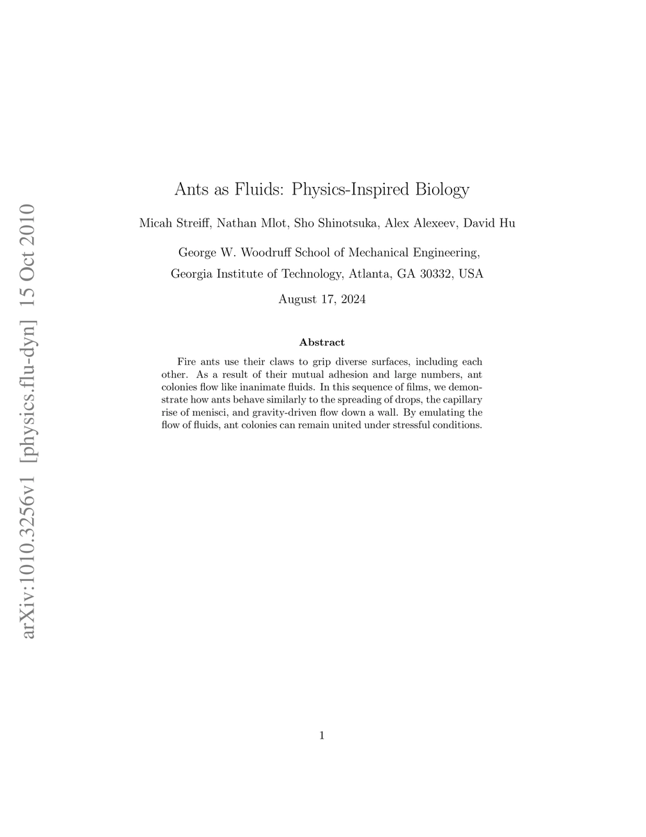 Fire ants use their claws to grip diverse surfaces, including each other. As a result of their mutual adhesion and large numbers, ant colonies flow like inanimate fluids. In this sequence of films, we demonstrate how ants behave similarly to the spreading of drops, the capillary rise of menisci, and gravity-driven flow down a wall. By emulating the flow of fluids, ant colonies can remain united under stressful conditions.