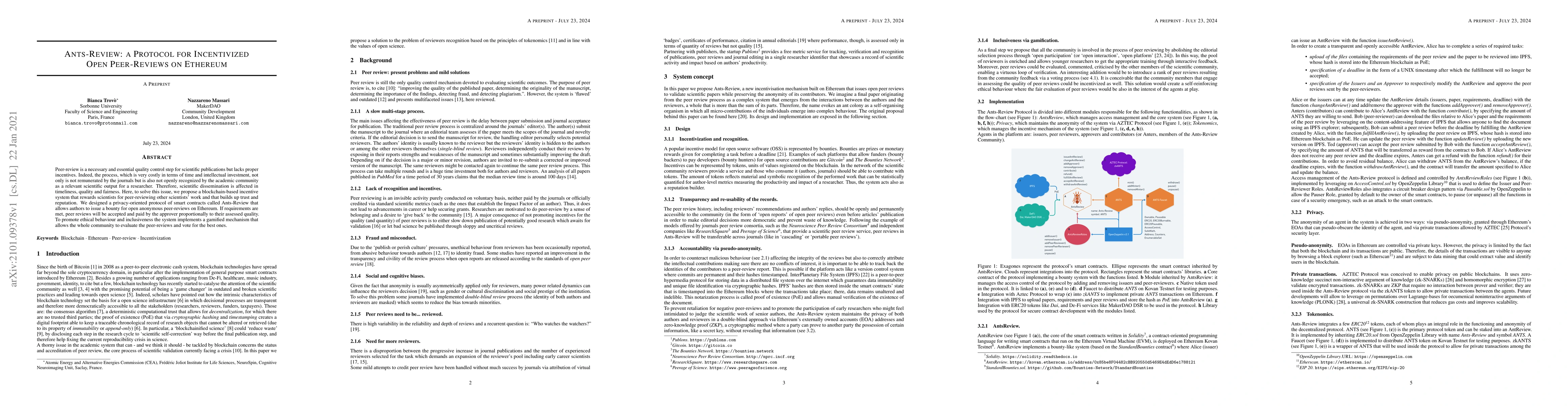 This paper proposes Ants-Review, a blockchain-based incentive system on Ethereum to reward scientists for peer-reviewing others' work, addressing the lack of recognition and remuneration in traditional peer-review processes. The system uses smart contracts to issue bounties for anonymous reviews, with payments based on review quality, and includes a community-driven evaluation to promote ethical behavior.