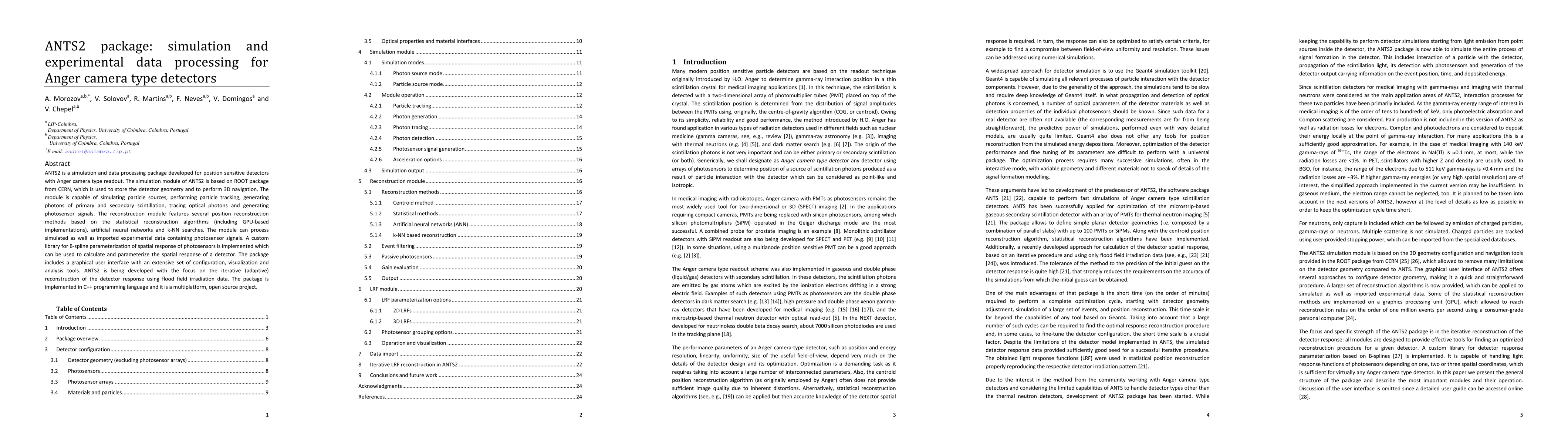 A software package called ANTS2 has been developed to simulate and analyze data from Anger camera type detectors used in particle physics experiments. It includes tools for simulating particle interactions, reconstructing detector responses, and processing experimental data.